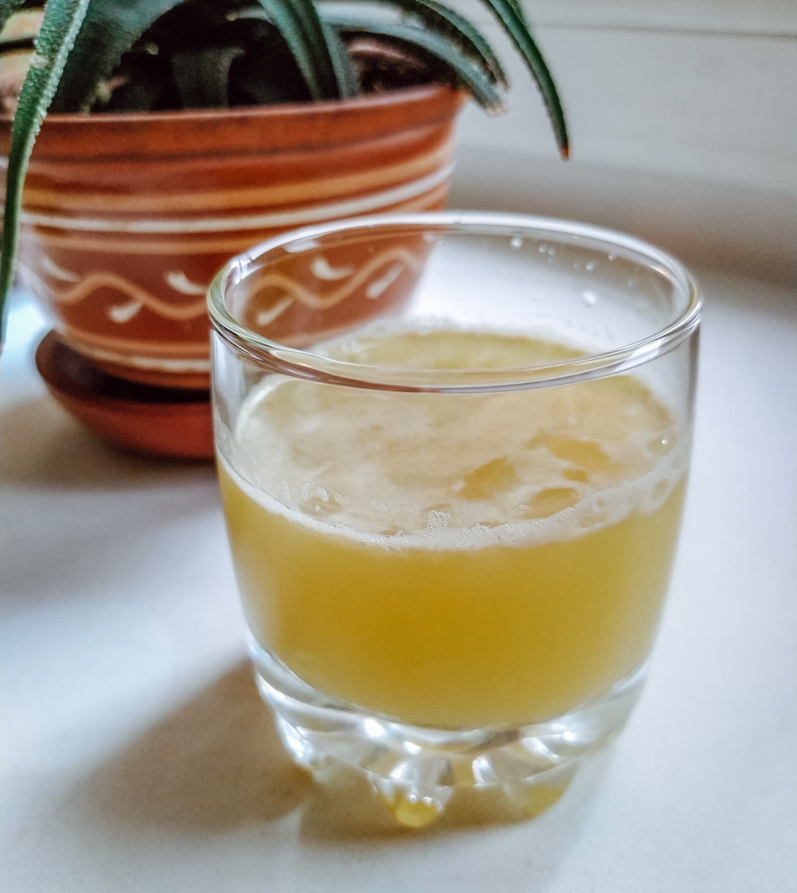 Отжим сока шел со скрипом — буквально. Прибор издавал душераздирающий скрип, но сок отжимал исправно, не останавливаясь. Шнек не всегда захватывал дольки, так что приходилось помогать ему толкателем. Пены вышло немного, хотя на фото шапка выглядит внушительно из-за искаженной перспективы. Сок без ощутимой мякоти, но полупрозрачный, очень ароматный и ядрено кислый. Жмых очень сухой и плотный — пришлось потрудиться над выковыриванием его из канала в зажиме-носике.