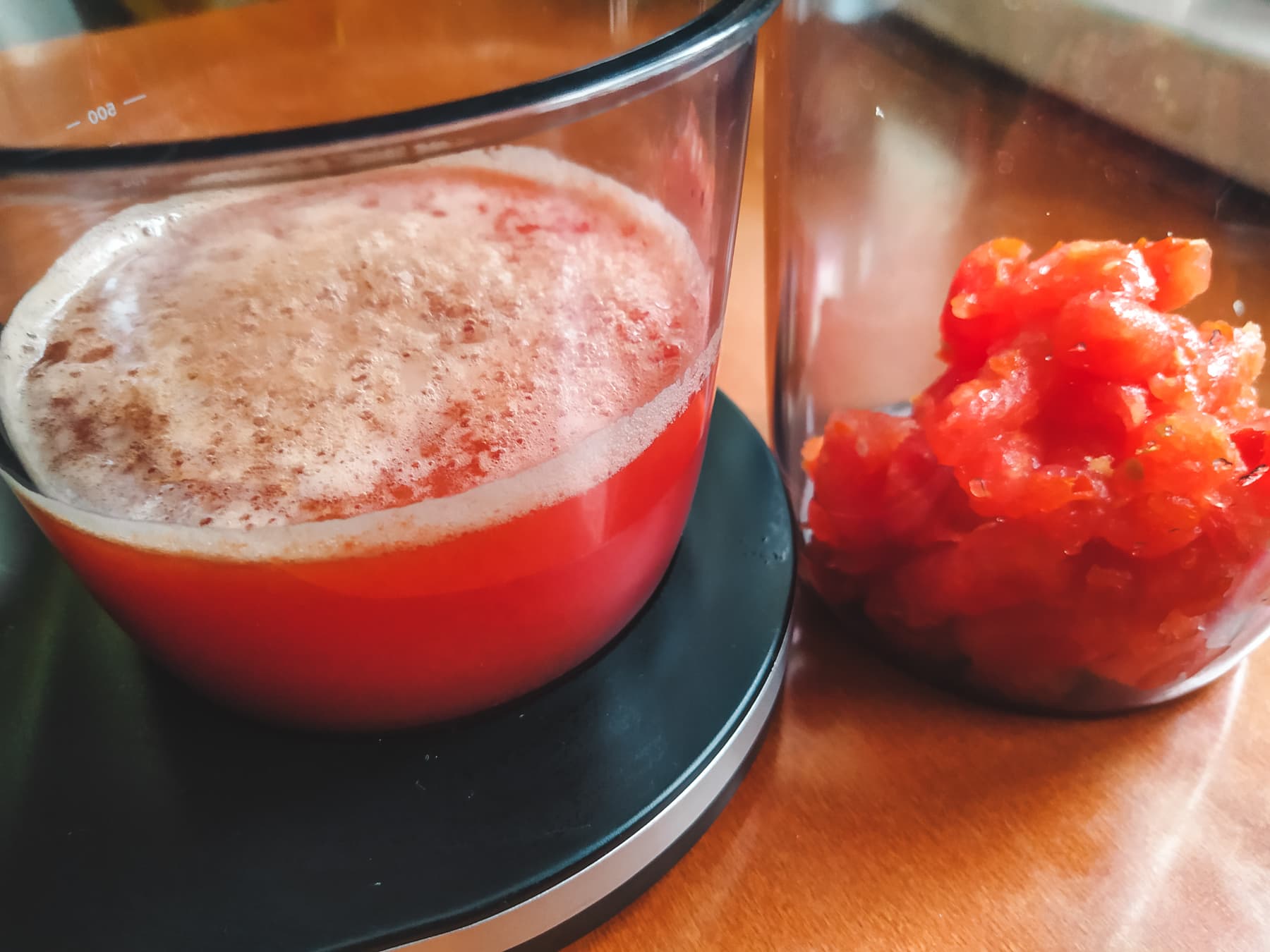 За минуту мы получили 310 граммов сока с тонким слоем пенки.