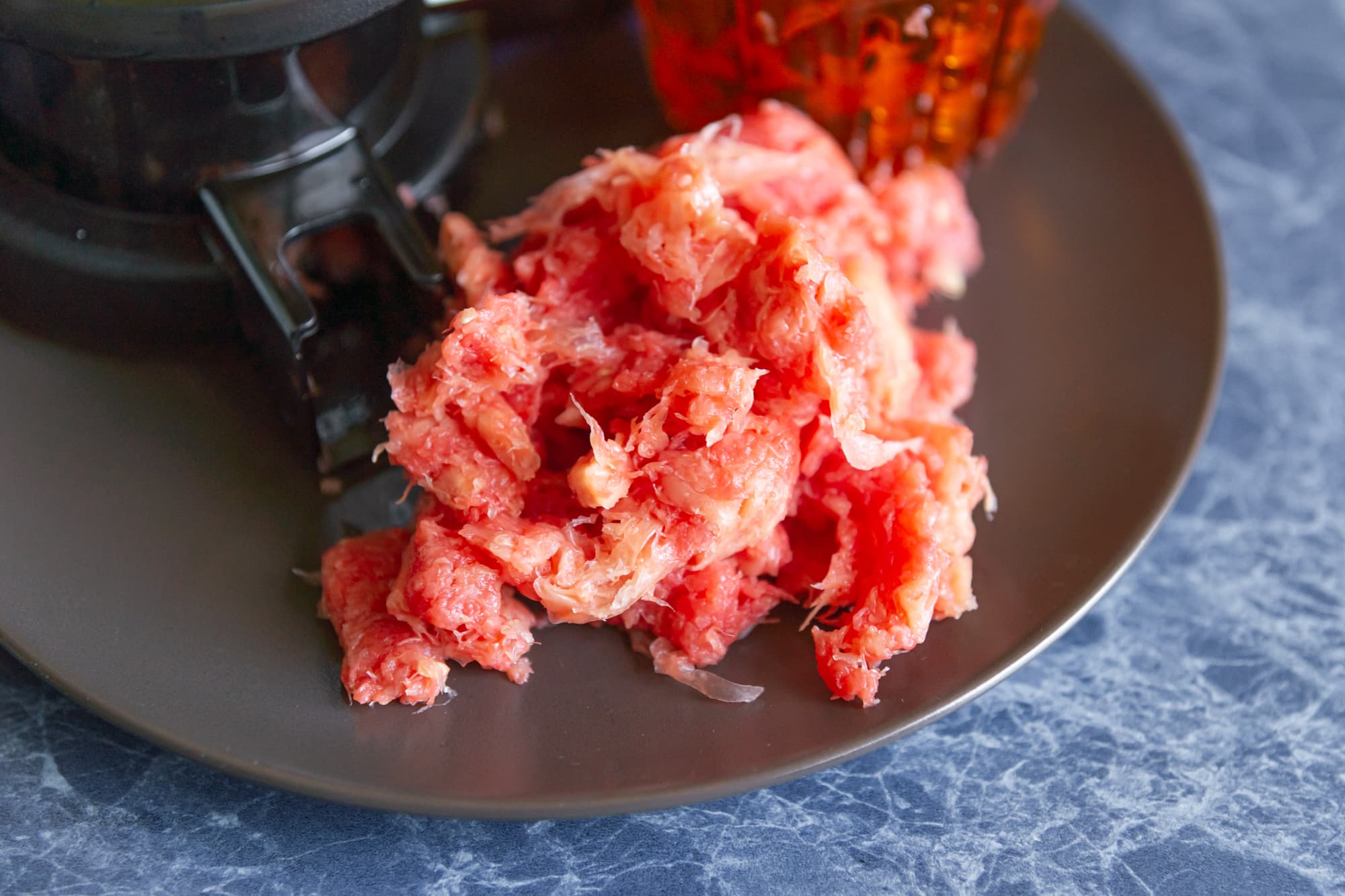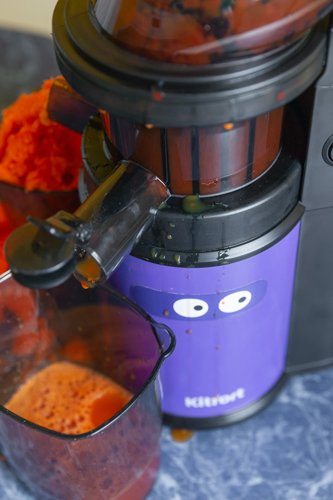 Жмых вышел почти сухой, при сильном сжатии в руке из него выделялось совсем незначительное количество сока. Отходов оказалось сильно больше, чем мог вместить в себя контейнер и по окончании теста часть из них оказалась на столе. Кроме того, под конец, из-под чаши с фильтром, наружу просочилось немного сока.