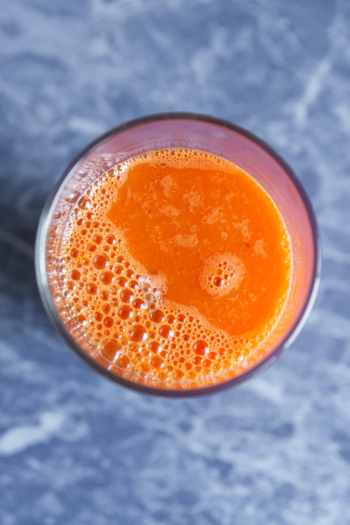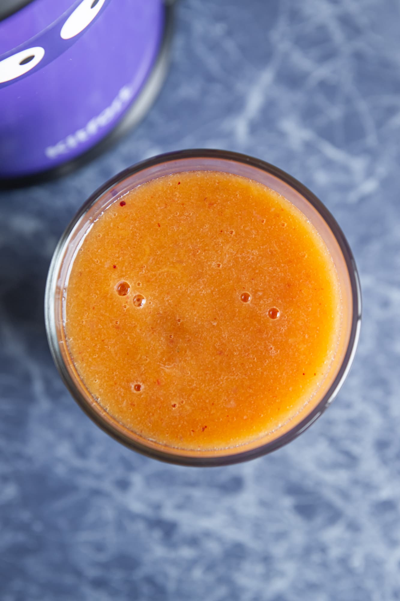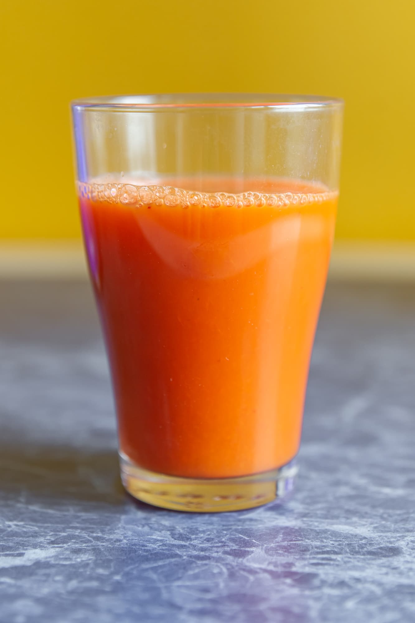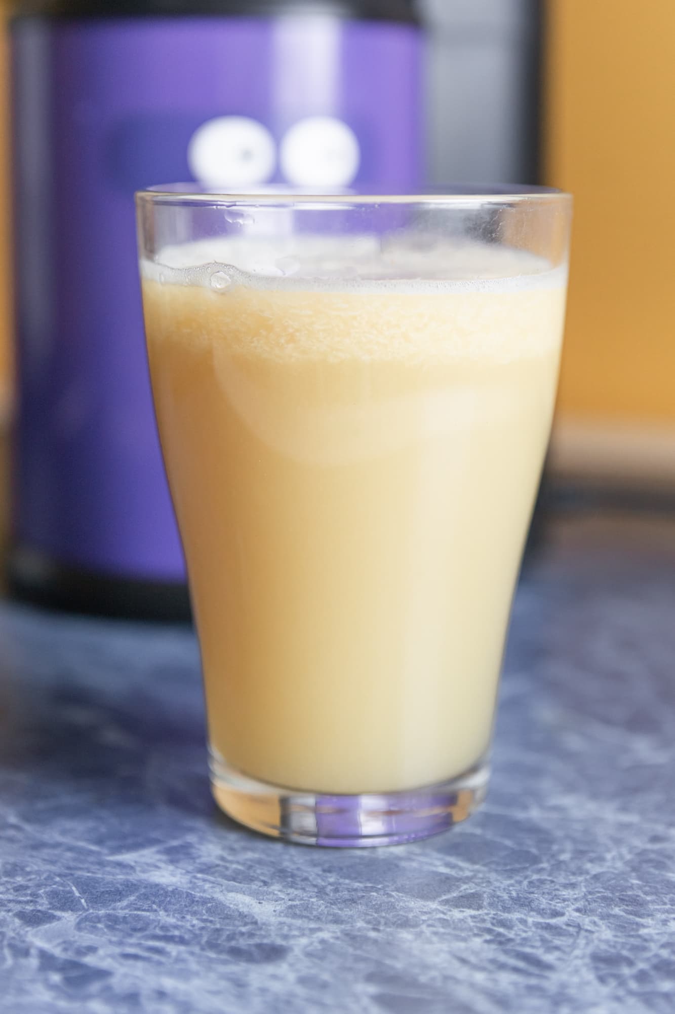 Пены получилось немало, сам сок — с небольшим количеством мякоти, плотный, с насыщенным кисло-сладким вкусом.