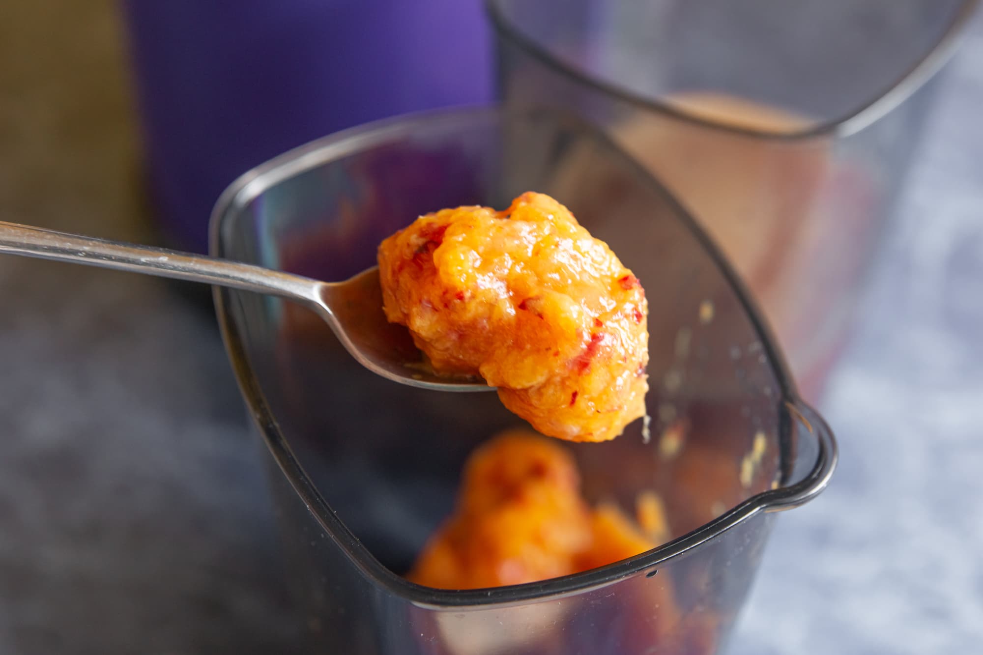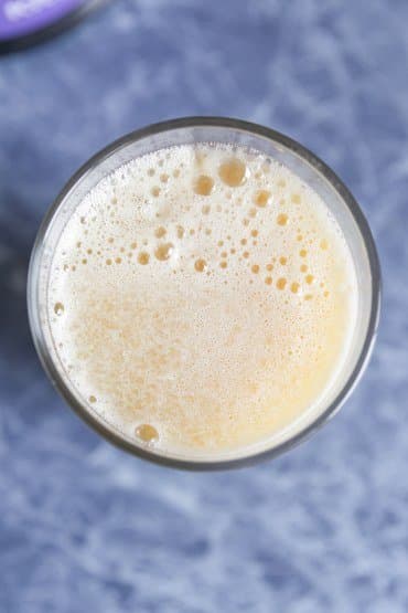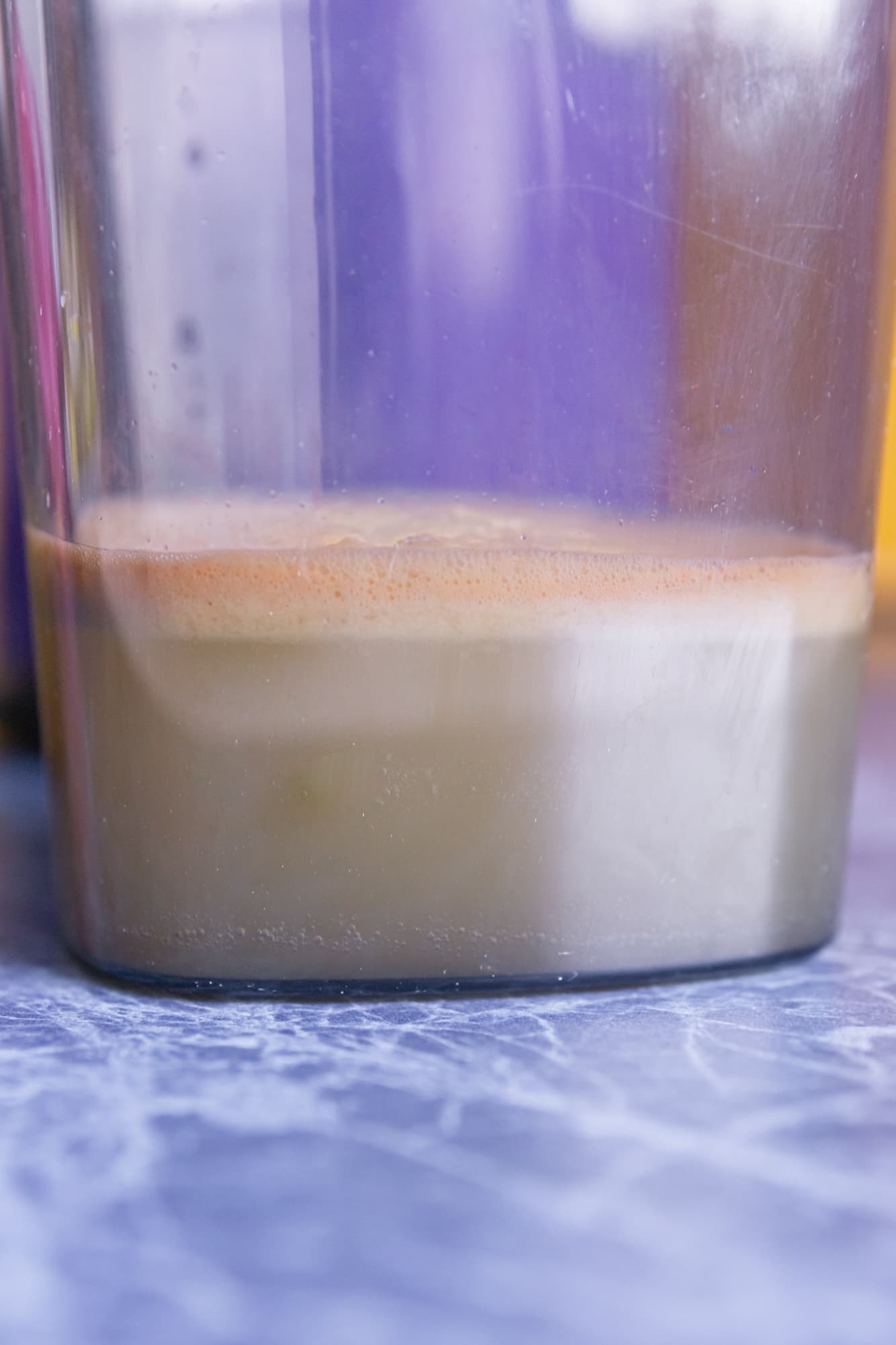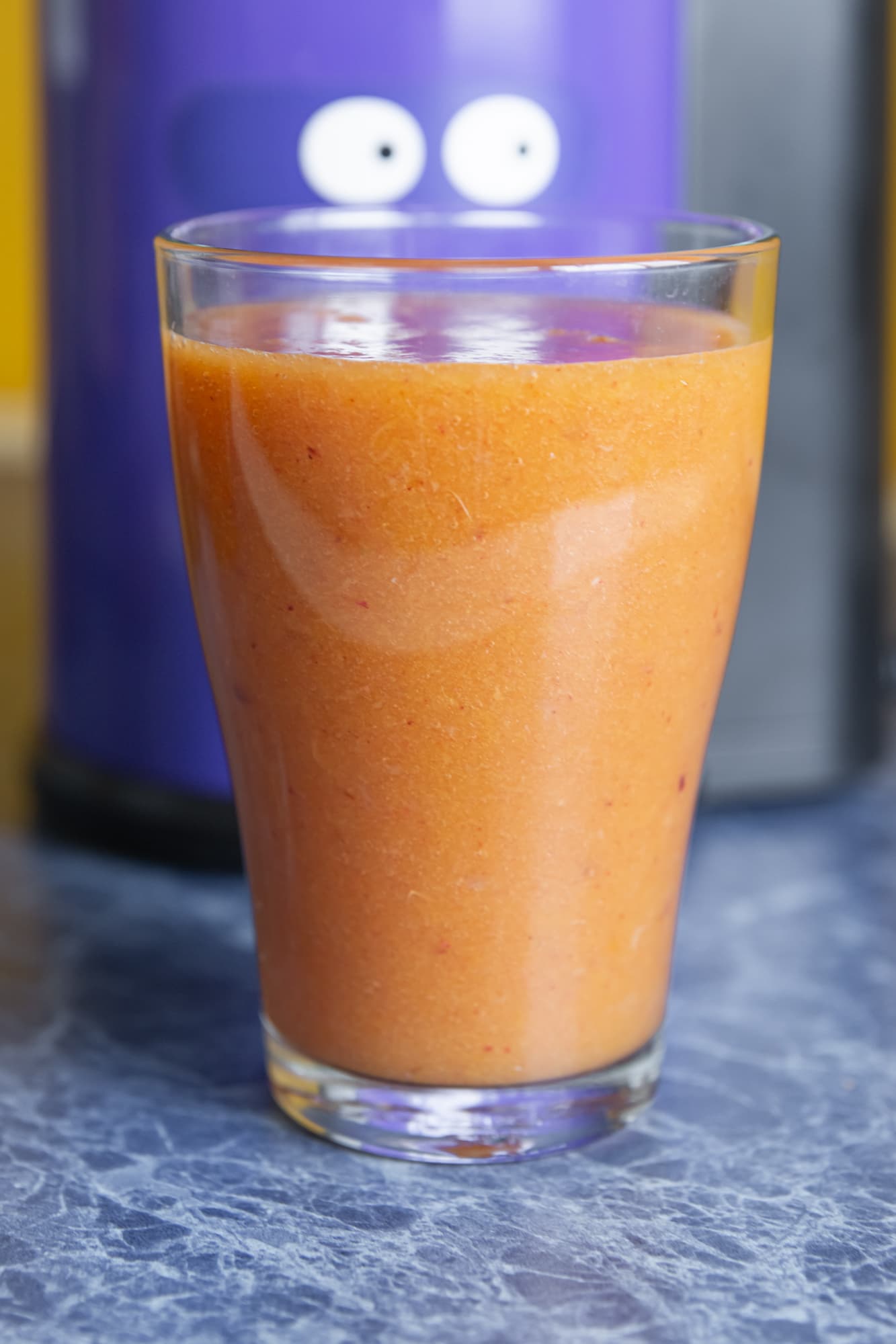 Пены получилось немало, сам сок — с небольшим количеством мякоти, плотный, с насыщенным кисло-сладким вкусом.