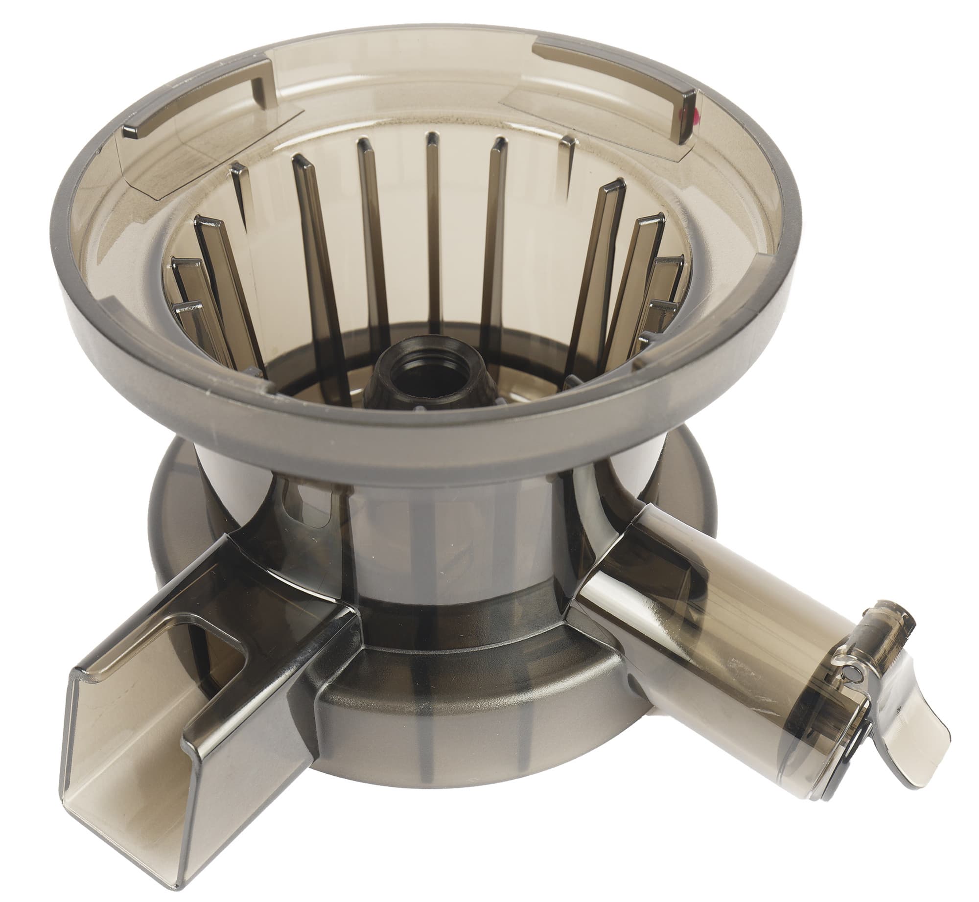По бокам из чаши выходят два носика: для сока и жмыха. Отверстие для выхода сока оснащено прорезиненным клапаном с небольшой ручкой. Более широкий носик для отходов со стороны чаши закрывается резиновым язычком. В центре чаши — цилиндрическое возвышение с резиновым кольцом сверху, на которое устанавливается шнек.