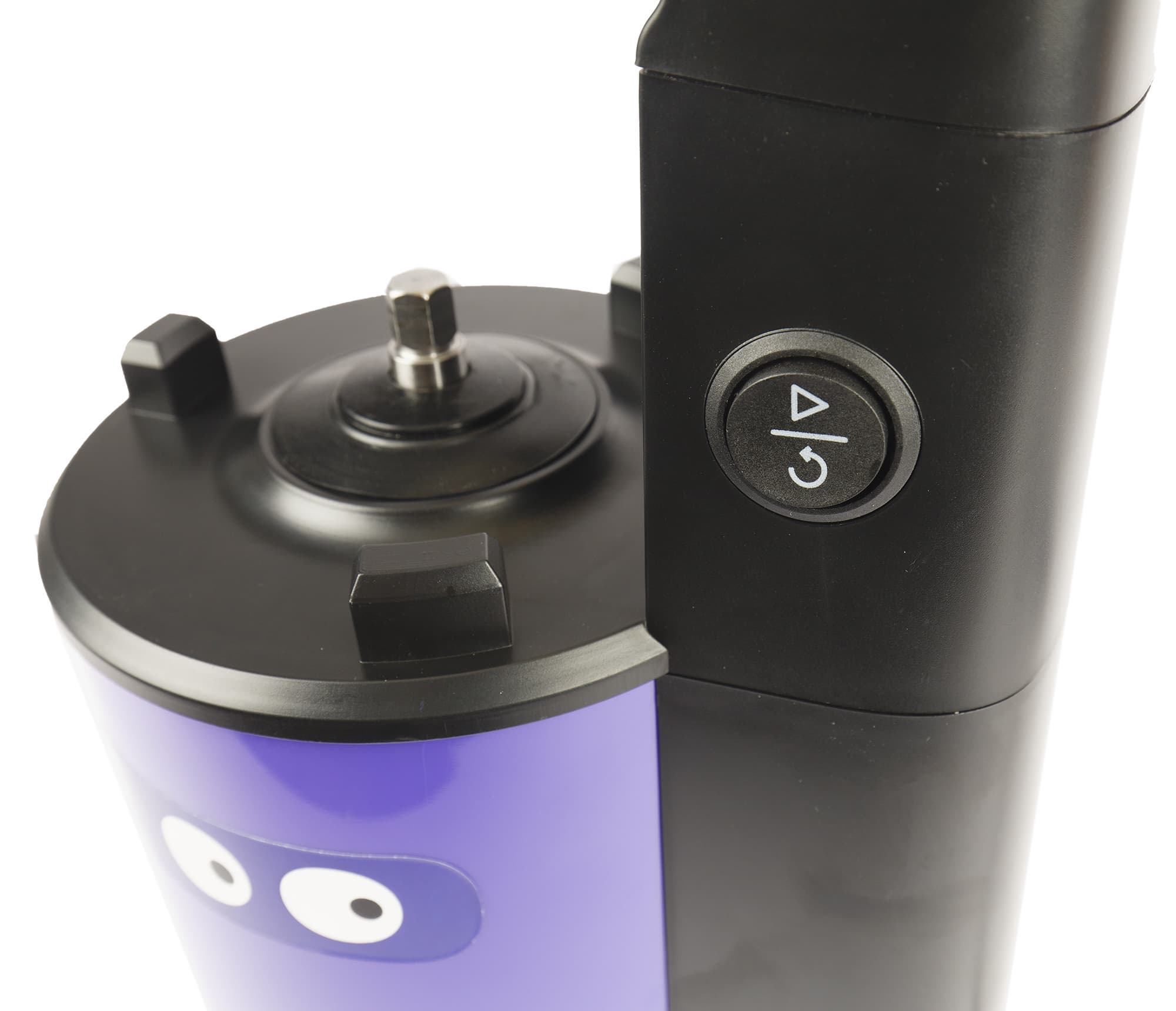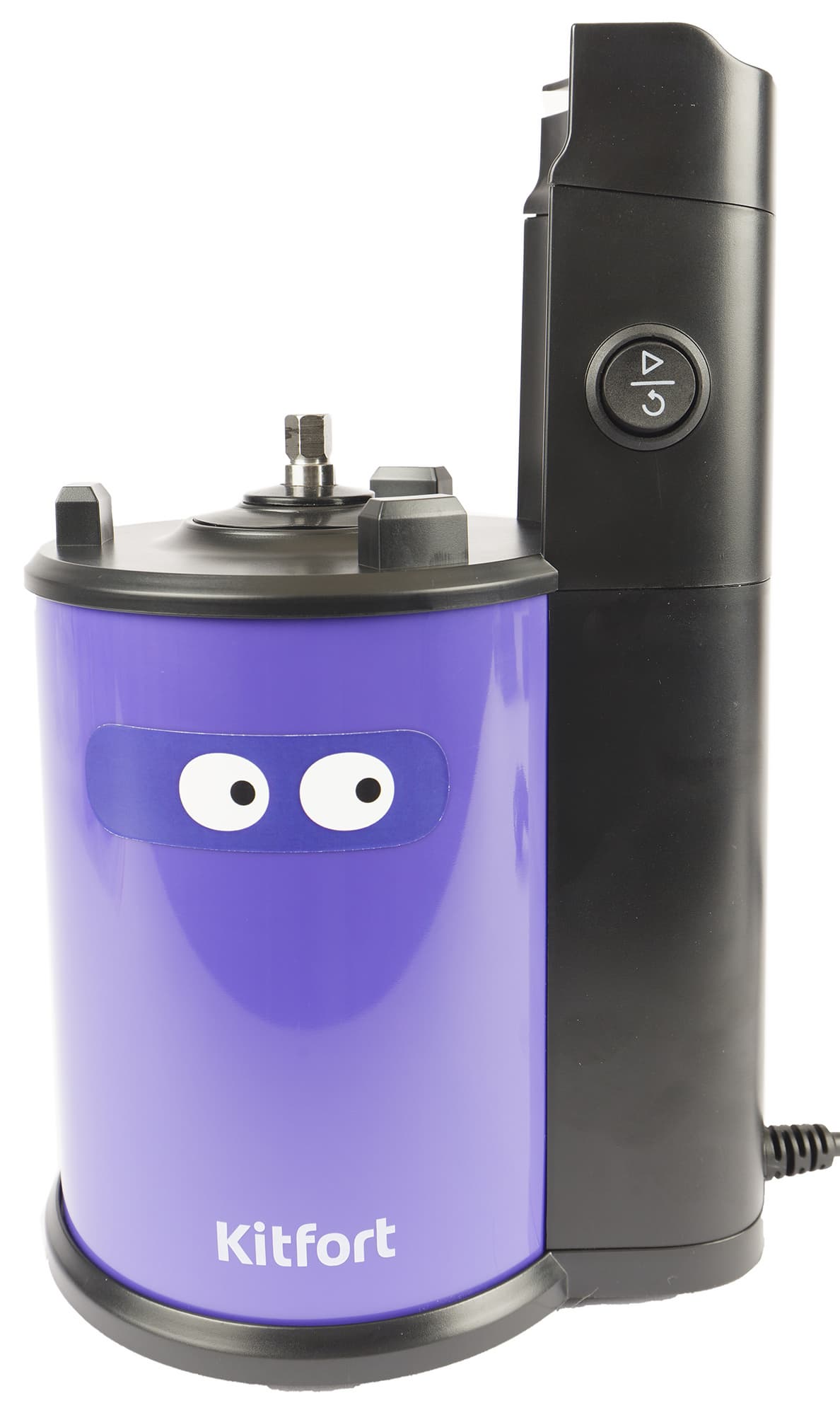 Моторный блок Kitfort KT-1129 с забавной наклейкой-глазками выполнен из черного пластика с фиолетовой металлической накладкой.