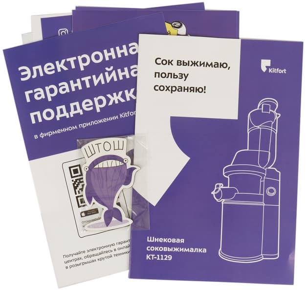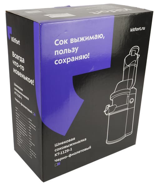 Соковыжималка поставляется в упаковке из прочного глянцевого картона оформленной в фирменной стилистике Kitfort. На черном фоне — векторное изображение прибора, в левом верхнем углу — фиолетовая вставка со слоганом. На боковых гранях размещена информация о технических характеристиках устройства и краткое описание его основных достоинств. Ручкой коробка не оснащена.
