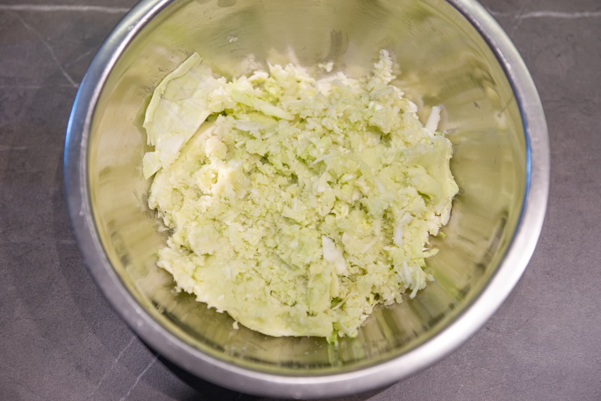 Мы крупно нарезали килограмм белокочанной капусты и принялись энергично закидывать его в горловину, придавливая сверху толкателем.