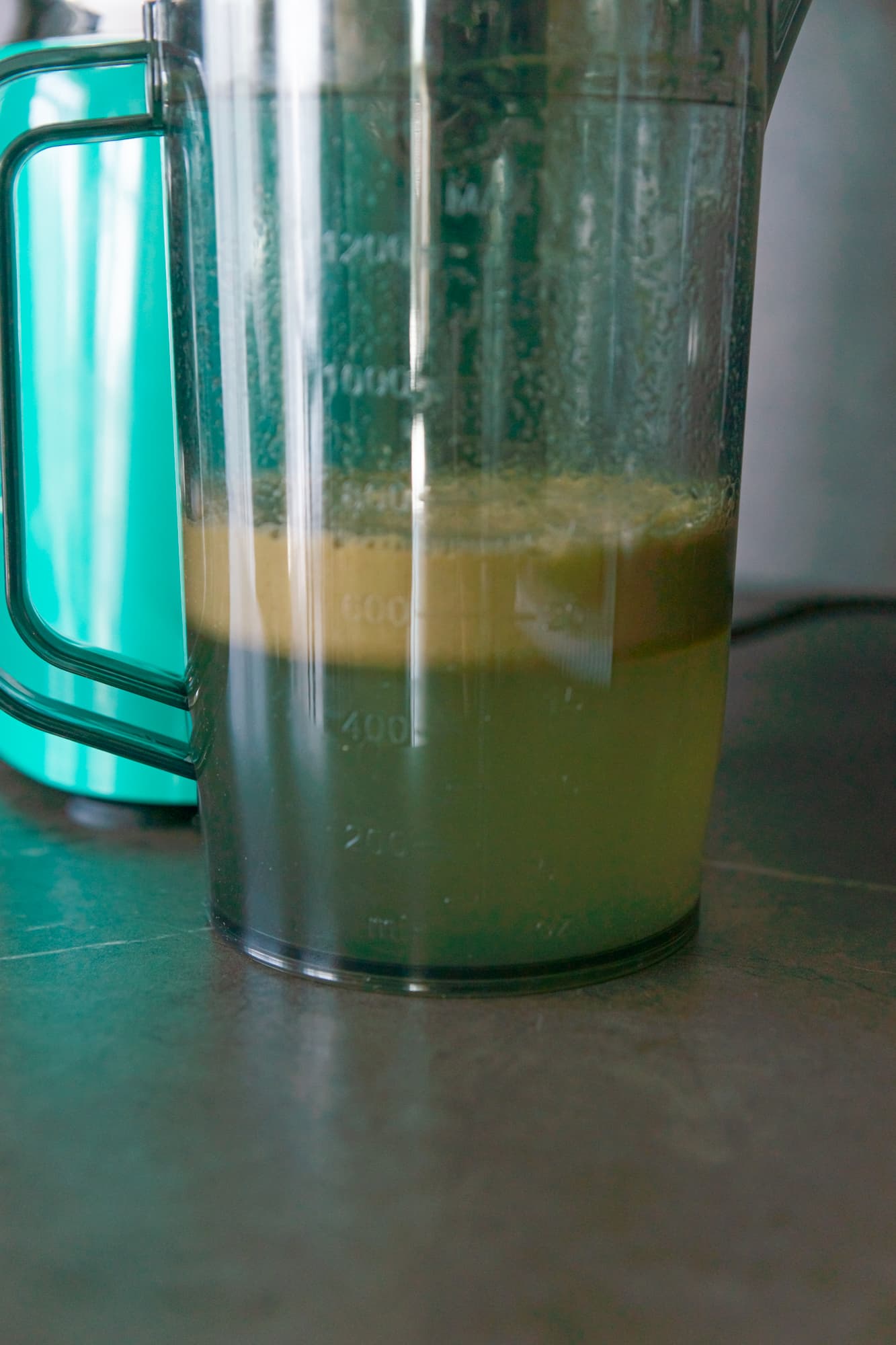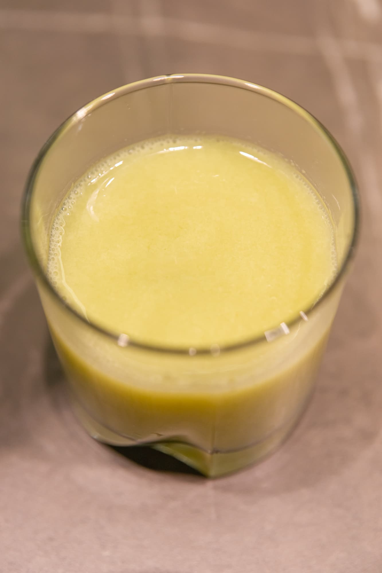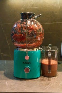 Быстро, шумно и с вылетающими из горловины частичками фруктов мы получили прозрачный сок с густой шапкой пены.