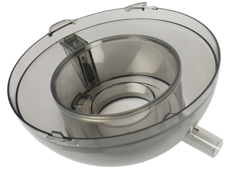 На моторный блок устанавливается пластиковая прозрачная чаша, а в нее помещается мелкосетчатый фильтр с теркой. Соединение вала двигателя с отжимающей сеткой — пластик/пластик.