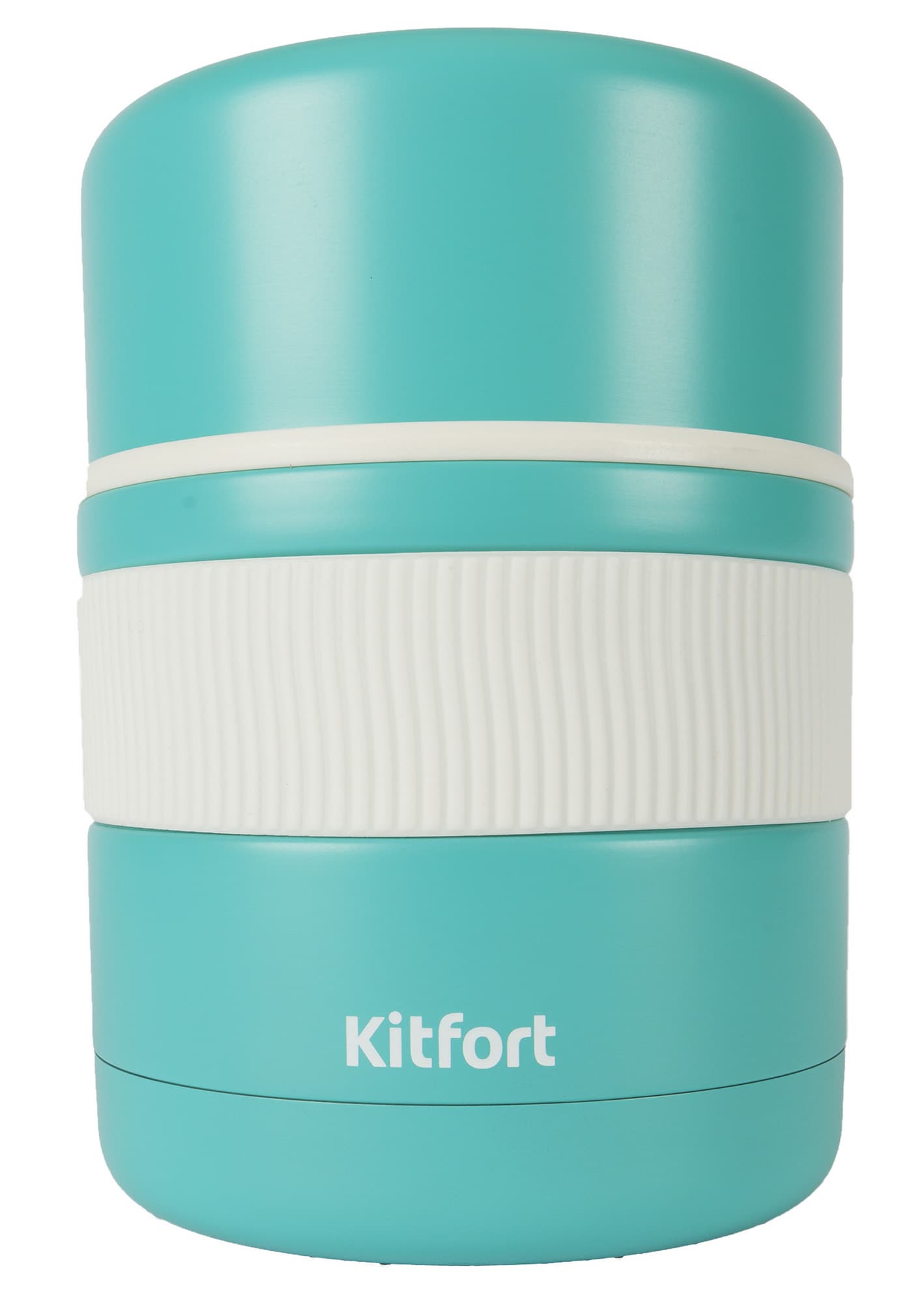 Ланч-бокс упакован в небольшую картонную коробку, оформленную в фирменном стиле производителя. На лицевой ее стороне размещается векторное изображение изделия, индекс модели, ссылка на сайт, а также слоган, свой для каждого класса продукции Kitfort. Для ланч-боксов выбран девиз «Сохраняю температуру и вкус!».