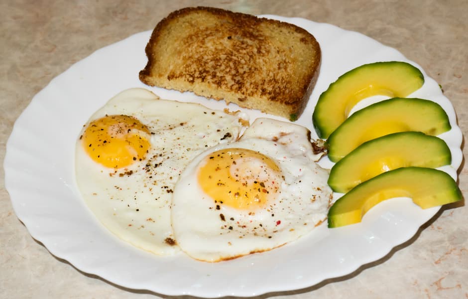 Белок полностью «схватился», желток прогрелся, немного загустел и достиг желаемой консистенции. Яичница нигде не пригорела, хотя центральная часть оказалась прожаренной чуть-чуть интенсивнее, чем края. Затем на оставшемся масле подсушили четыре ломтика хлеба. На это потребовалось примерно 5 минут. Хлеб отлично поджарился; хрустящий ломтик приятного румяного вида отлично дополнил нежную текстуру яичницы.