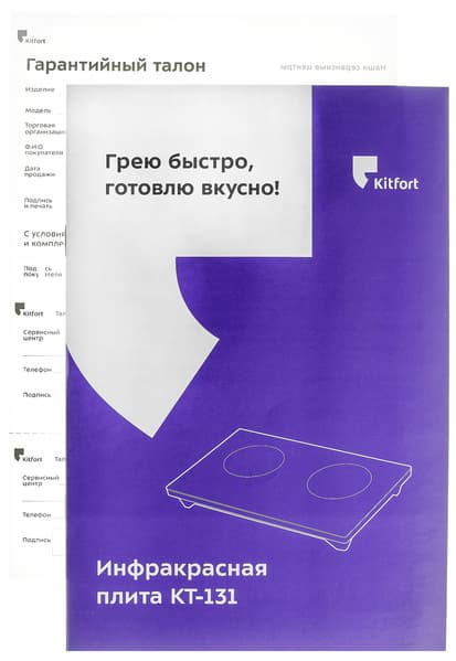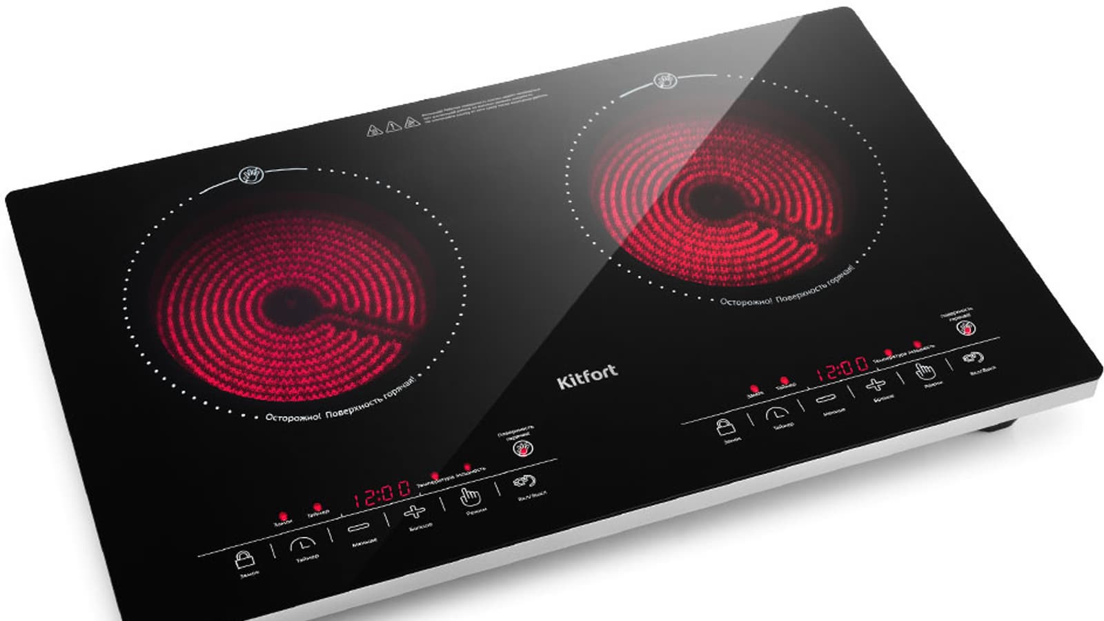 Инфракрасная плитка Kitfort KT-131 привлекает не только своим внешним видом, но и возможностями. Она допускает использование любой посуды, быстро нагревается, снабжена двумя конфорками мощностью 1400 и 1800 Вт.
