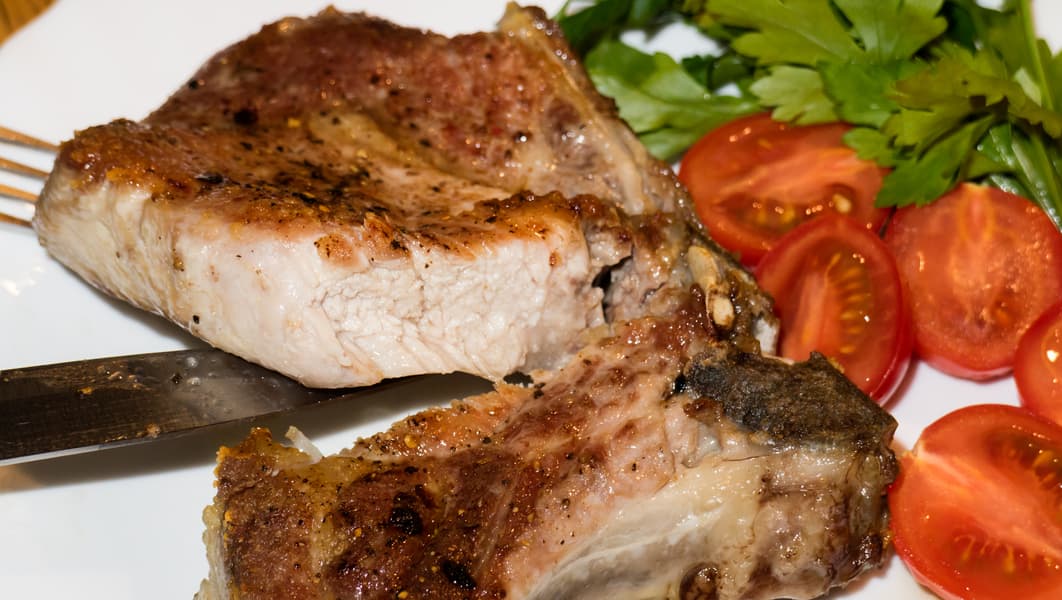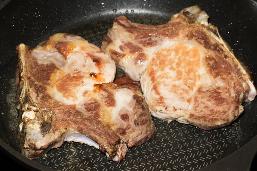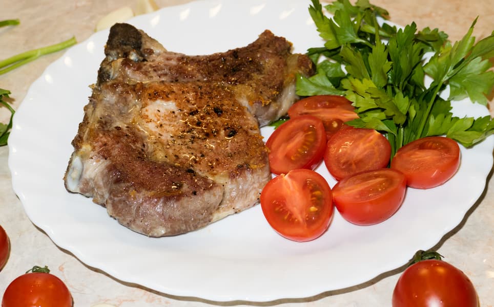 Изначально хотелось поджарить стейк, однако подходящий говяжий отруб стоит совершенно неприличных денег. К тому же нам удалось подружиться с мясником в недавно открывшемся небольшом магазине, поэтому теперь в руки попадают интересные части туши. Так, в этот раз у нас оказалась пара кусочков свинины на кости. Куски очень красивые, достаточно толстые, при наличии косточки отбивать их смысла нет. Поэтому было решено хорошо обжарить мясо так, а потом довести свинину до готовности под крышкой.