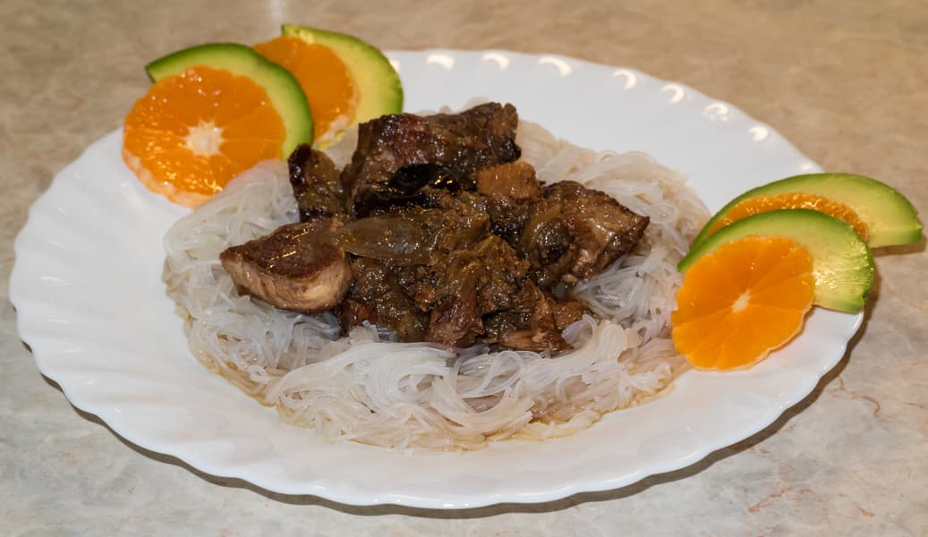 Затем сложили румяные кусочки мяса в кастрюлю, а на оставшемся жиру пожарили одну большую луковицу. Добавили ее к мясу, посолили, всыпали горсть чернослива, а потом вдруг включилась чистая импровизация: немного воды, половник бульона из рядом стоящей кастрюли, немного соевого соуса. Затем в ход пошла молотая гвоздика, корица, кориандр и даже кардамон.