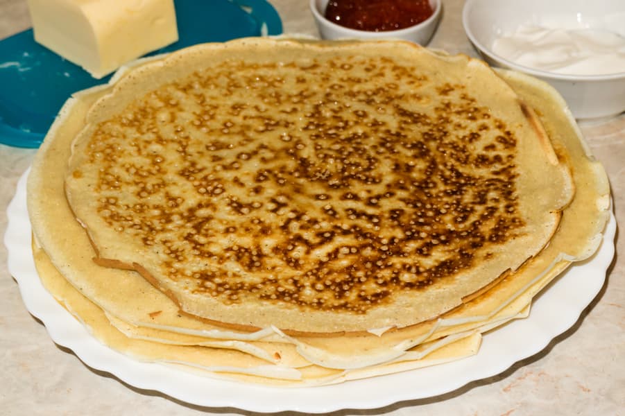- Видимо, из-за ощутимой разницы в диаметре дна и полезной площади большой сковороды (9 см!), края блинов получались бледнее.