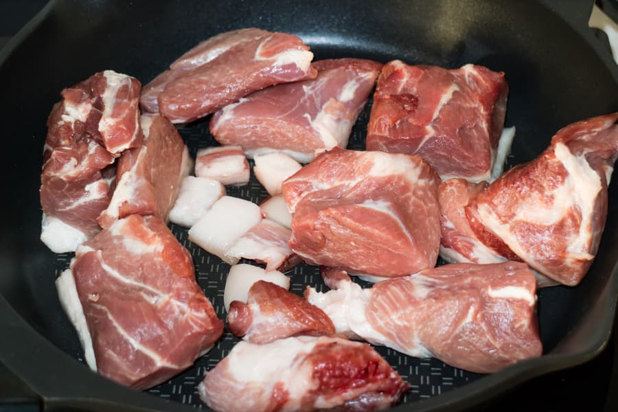 Параллельно с приготовлением щей мы потушили свинину. Сначала куски были обжарены на сковороде.