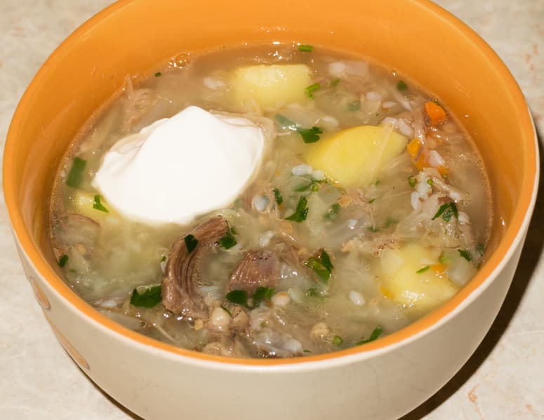 Когда мы подошли к выключившейся по истечении времени плитке, бульон был готов: насыщенный, с хорошо разварившимся коленом. Процедили его, часть отлили и заморозили: пять литров щей — это как-то чрезмерно. Всыпали картошку и продолжили варить щи. Когда картошка и репчатый лук с морковкой (добавленные по ходу варки) были почти готовы, дошла очередь кислой капусты и горсточки гречневой крупы. После закипания уменьшили нагрев до 300 Вт, установили таймер на 25 минут и отошли от плиты. В самом конце добавили черный перец, лавровый лист, немного тмина и свежей петрушки.