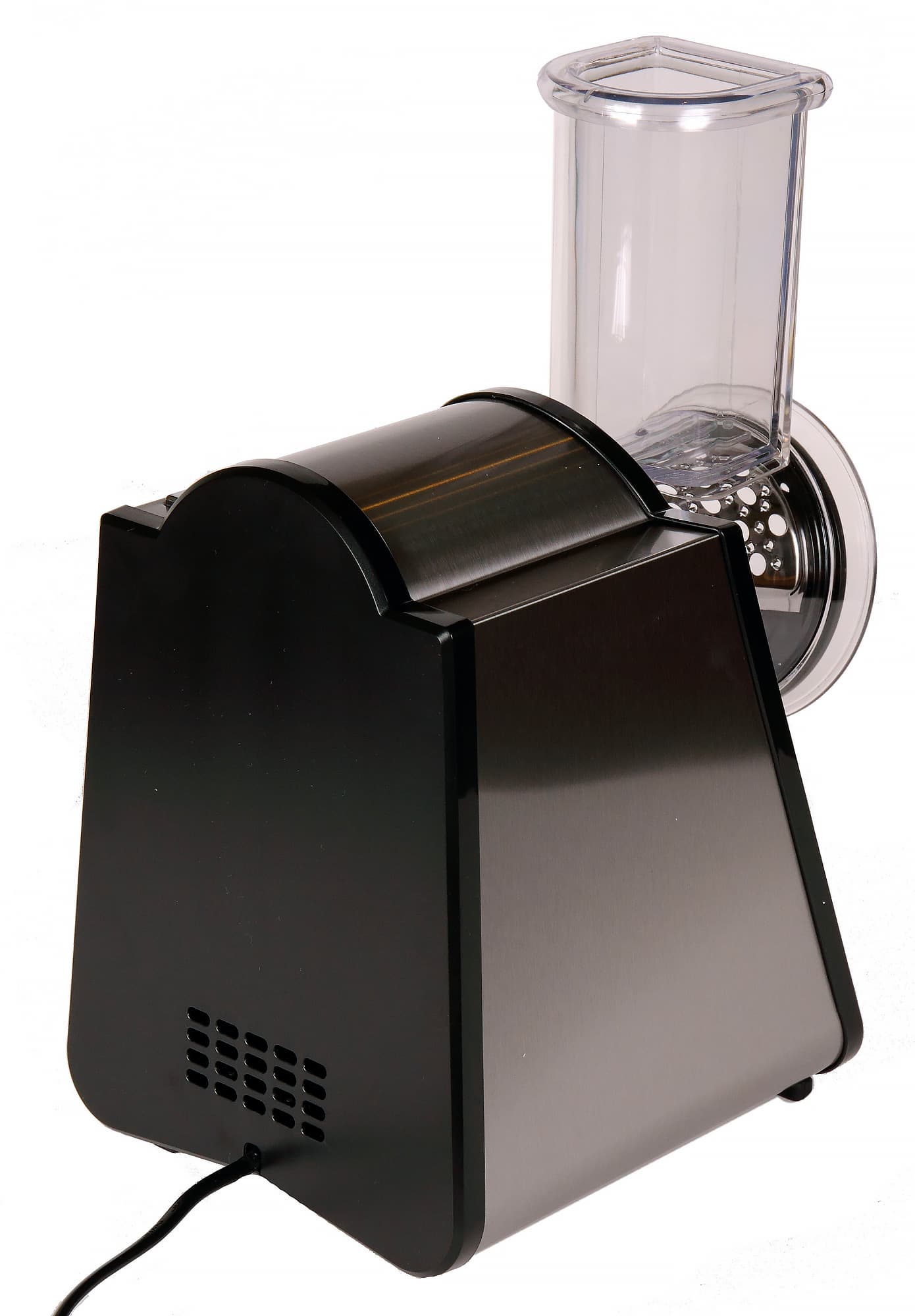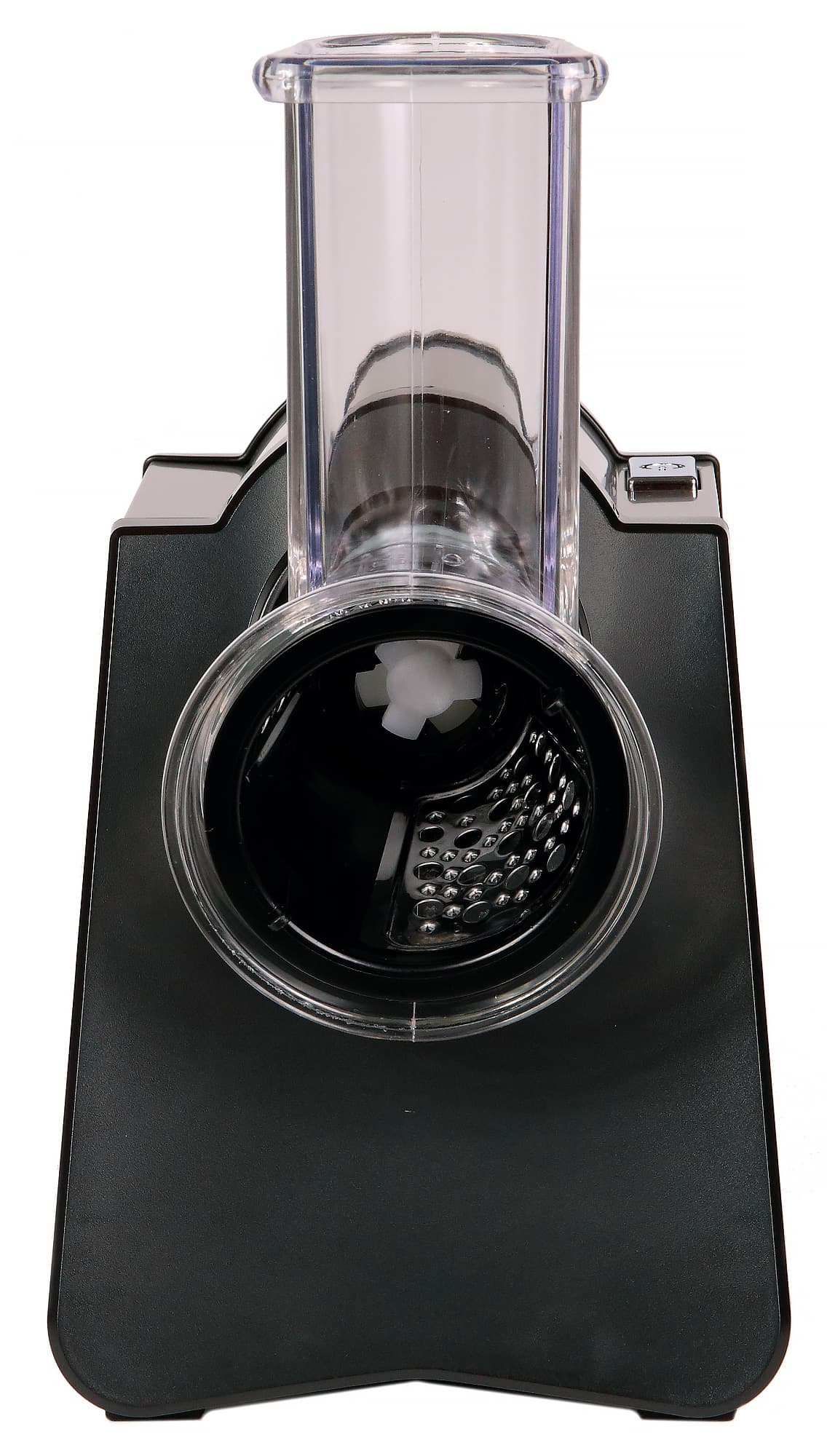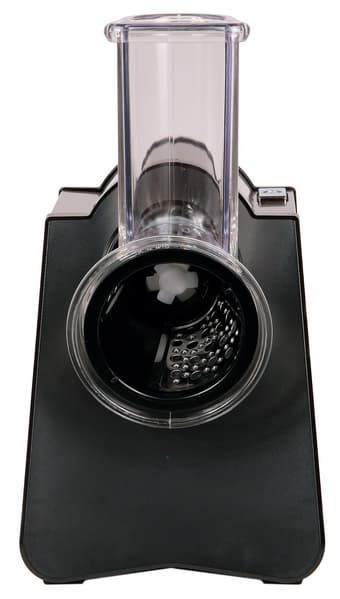 Единственное неудобство, как мы уже указывали выше, связано с особенностями управления — барабан крутится только тогда, когда нажата кнопка включения. Таким образом, одна рука всегда занята, а второй приходится и подавать продукт в загрузочное отверстие, и придавливать его к ножам толкателем. В результате пользователь вынужден выполнять ряд лишних действий: брать продукт, заталкивать его в загрузочное отверстие, брать толкатель, проталкивать, отложить толкатель, взять следующий кусок, опять взять толкатель, затем опять его отложить и т.д. Впрочем, к этому неудобству приспосабливаешься довольно быстро, а скорость работы и безопасность не сопоставимы с натиранием и шинковкой овощей на обычной ручной терке.