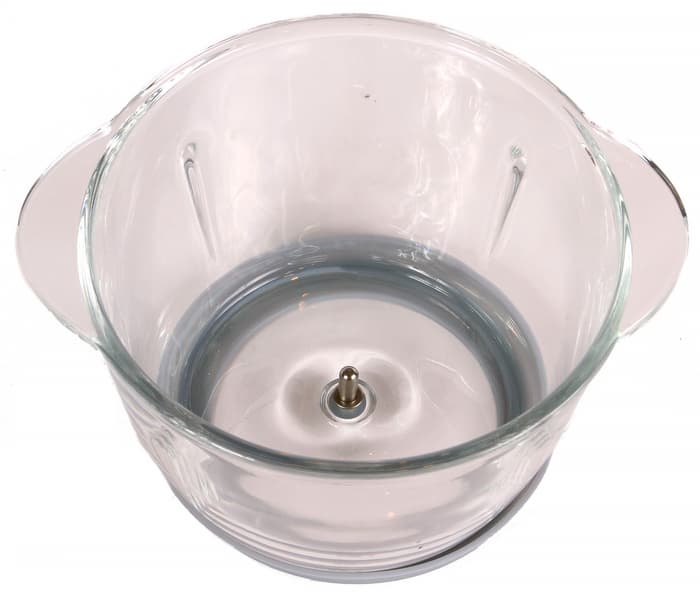 Чаша изготовлена из толстого стекла — ее вес составляет 720 г. Прозрачный материал позволяет контролировать процесс измельчения продуктов и вовремя остановить работу или принять решение о ее продолжении. По бокам с внешних сторон имеются два выступа-держателя, что делает эксплуатацию удобнее. По центру дна расположен неподвижный вал. На внутренней поверхности боковых сторон можно увидеть четыре невысоких выступа.
