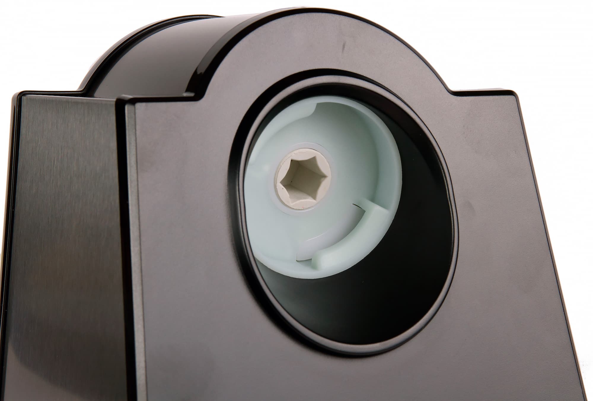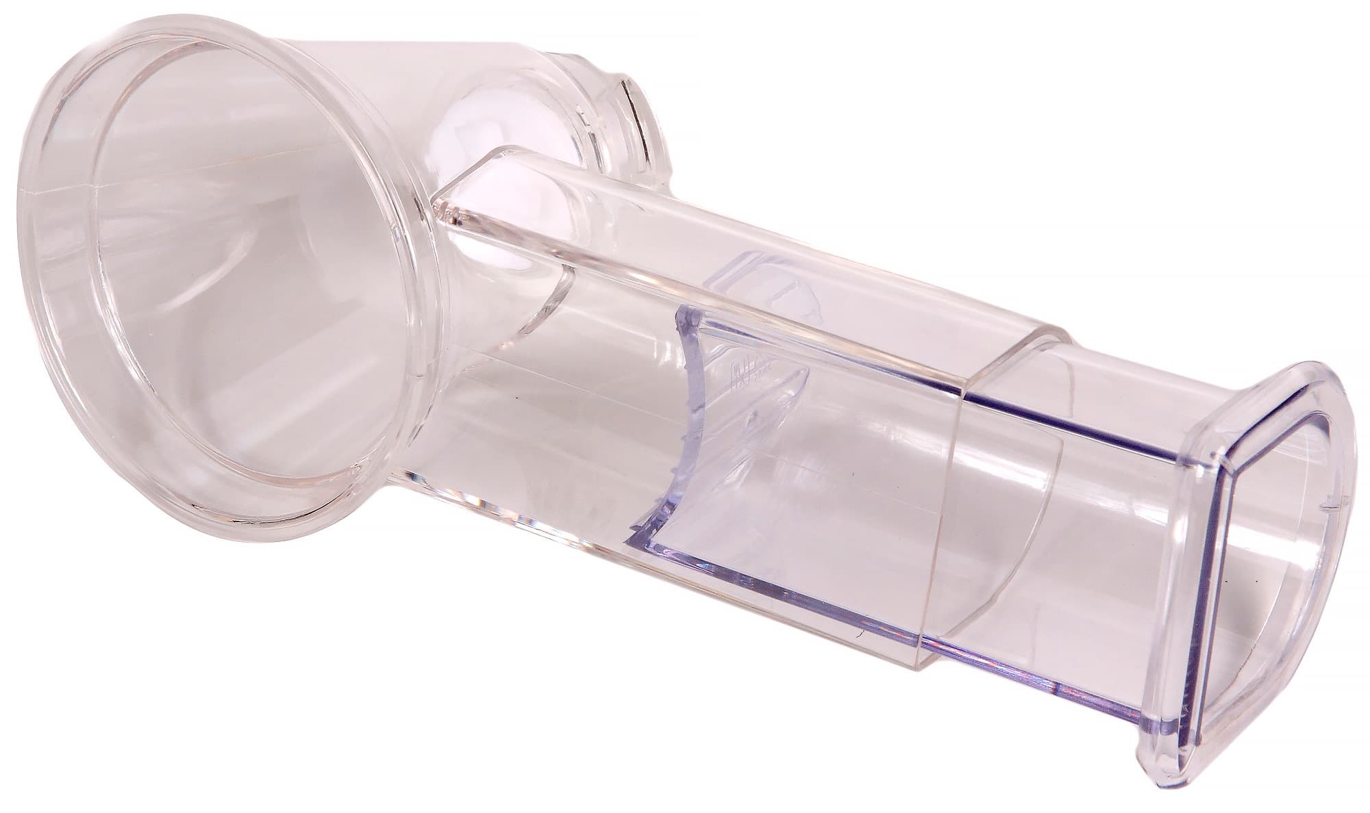 Ножевой блок и толкатель изготовлены из прозрачного пластика. Материал прочный на вид, визуально никаких недостатков не обнаружено. Толщина стенок насадки — около 2 мм. Размер загрузочного отверстия представляется нам достаточным для размещения в нем одной моркови, огурца или клубня картофеля среднего размера. По центру размеры загрузочного отверстия составляют 4,5×4,5 см. Форма — квадратная с двумя скругленными углами.