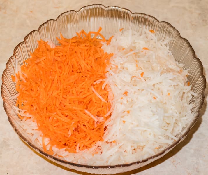 После первого опыта мы приготовили простой салат из свежих дайкона и моркови. Общий вес подготовленного сырья составил 667 г. Дайкон нарезали на четыре части, морковь помещали в загрузочное отверстие целиком. Все продукты были натерты чуть меньше, чем за две минуты (1 мин 57 сек), мощность в среднем составила 120-130 Вт, прибор потребил за время работы 0,004 кВт·ч.