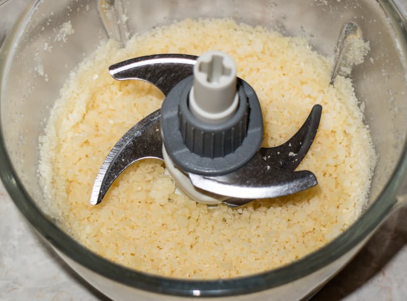Однако 15 секунд не хватило для получения однородно измельченного сыра — в массе встречались отдельные крупные кусочки. Продолжили измельчение. За одну минуту сыр достиг состояния сырной крошки — именно то, что требовалось. Продукт можно пересыпать в плотно закрывающийся контейнер и в течение нескольких дней использовать в различных кулинарных целях.