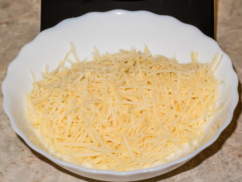 Таким образом измельченный сыр можно использовать для приготовления блюд с пастой, пиццы или блюд, предполагающих запекание, а также для салатов. Мы пошли простейшим путем — выдавили в сыр несколько зубчиков чеснока, добавили майонез и тщательно перемешали. Прекрасная закуска, приготовленная за пару минут, готова.