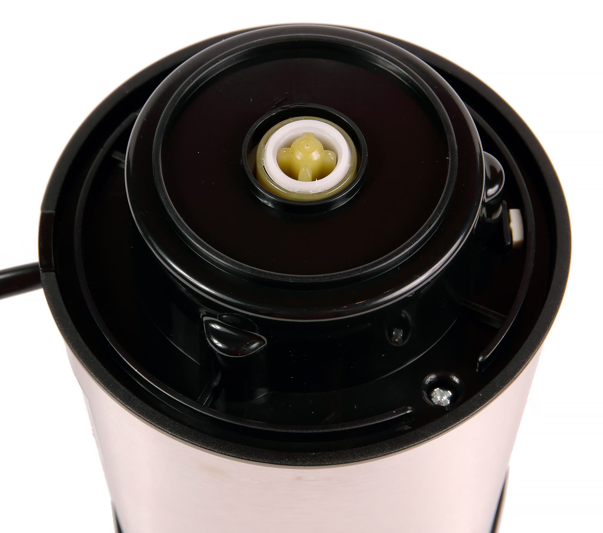 Габариты моторного блока невелики. В руках он размещается удобно, не скользит. Качество исполнения можно оценить как хорошее. Все детали надежно соединяются между собой, не обнаружено щелей, зазоров или непрочных креплений. С задней стороны отсека приклеен шильдик с технической информацией об изделии. Отсюда же выходит шнур электропитания. Длина кабеля, хоть и невелика, но достаточна, на наш взгляд, для комфортной эксплуатации — прибор можно установить как в непосредственной близости от розетки, так и на некотором отдалении от нее. Сверху находится кнопка включения/выключения. Кнопка большая, так что при работе на нее удобно надавливать внутренней стороной ладони практически не прикладывая никаких усилий.