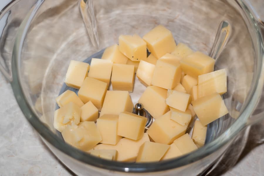 Инструкция рекомендует обрабатывать 200 г твердого сыра в течение 15 секунд. Мы взяли 150 г белорусского Гройцера, нарезали его на небольшие кусочки и измельчили импульсами в течение указанного времени.