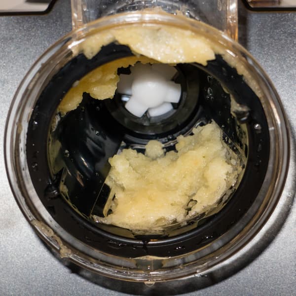После измельчения ¾ яблока мы остановили аппарат, вытащили нож, с помощью чайной ложки счистили со стенок натертую массу. Перемешали с выделившимся соком.