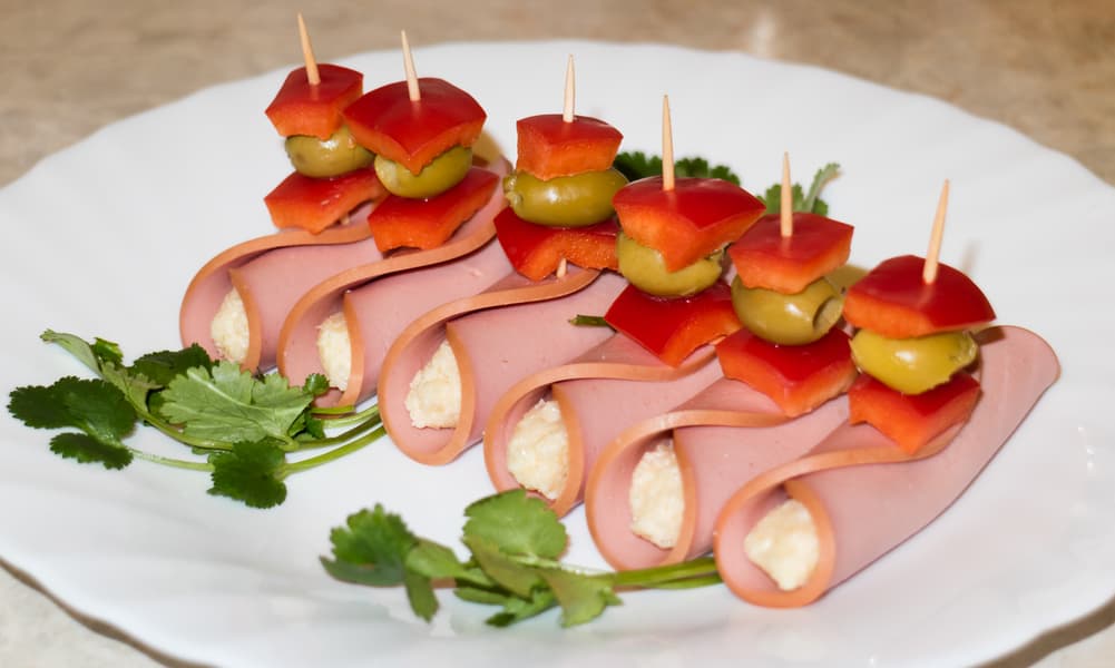 Колбасные рулетики с начинкой из твердого сыра