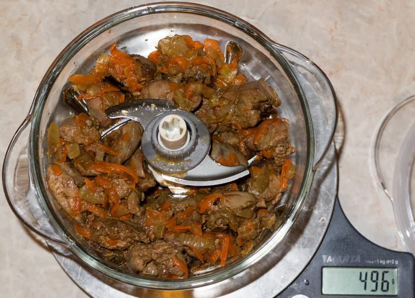 Общий вес приготовленных овощей и печени составил почти 500 г. Когда ингредиенты остыли, переложили их в чашу измельчителя и начали работать импульсами по несколько секунд. Когда масса стала однородной, добавили сливочное масло и продолжили измельчение на постоянной скорости. Общее время переработки составило чуть меньше двух минут — 1 минуту 45 секунд.