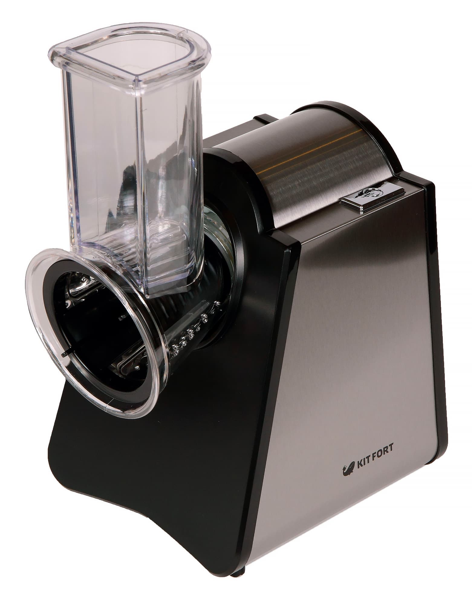 Электрическая терка Kitfort KT-1351 представляет собой незамысловатый по конструкции прибор, состоящий из моторного блока и насадки, куда вставляется необходимый нож. Стенки корпуса изготовлены из пластика черного и стального цвета. Материал обработан хорошо, все детали и части надежно скреплены между собой. Аппарат надежно и устойчиво располагается на столе.