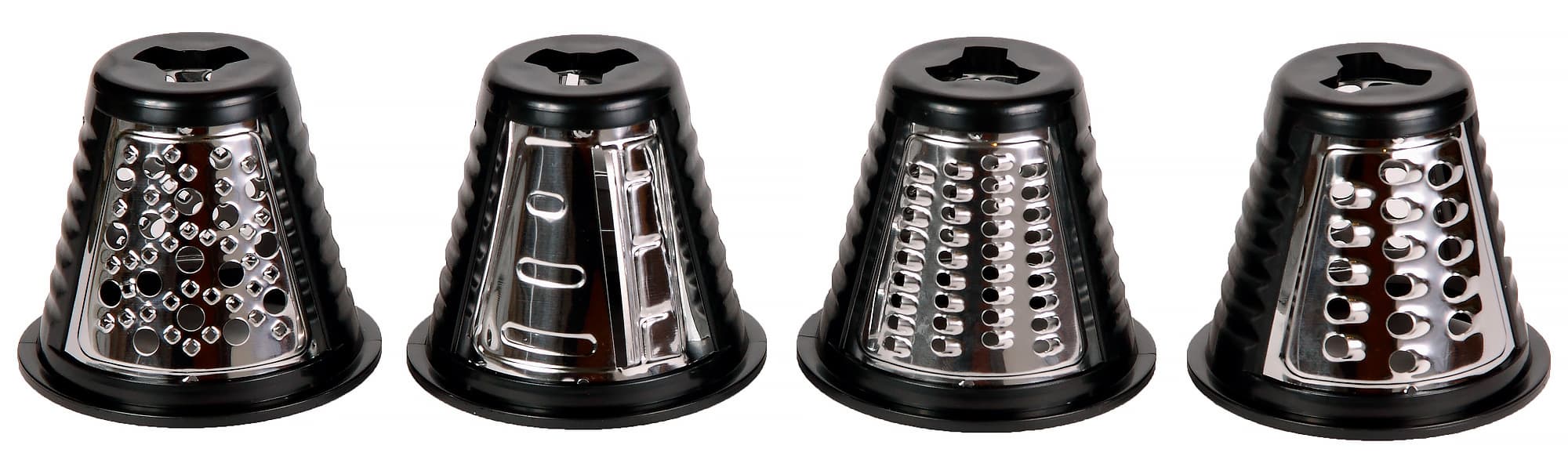 Терочные ножи представляют собой две расположенные напротив друг друга металлические пластины, закрепленные в пластиковом корпусе. Пластины различаются формой отверстий. Всего в комплект входят четыре ножа — мелкая, средняя и крупная терки, а также насадка для шинковки.