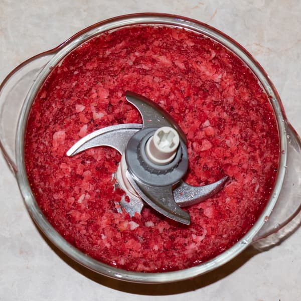 Работали импульсами по 1-2 секунды. Всего для измельчения понадобилось 8-10 импульсов. Клубничная масса состоит из кусочков примерно равной величины, она не гомогенизирована, но этого и не требовалось.