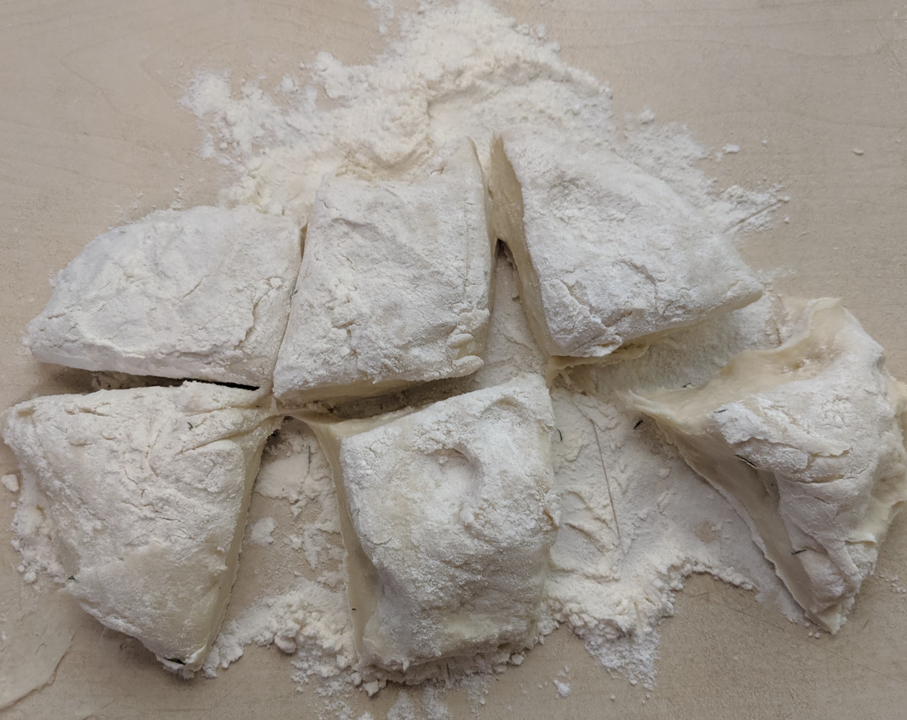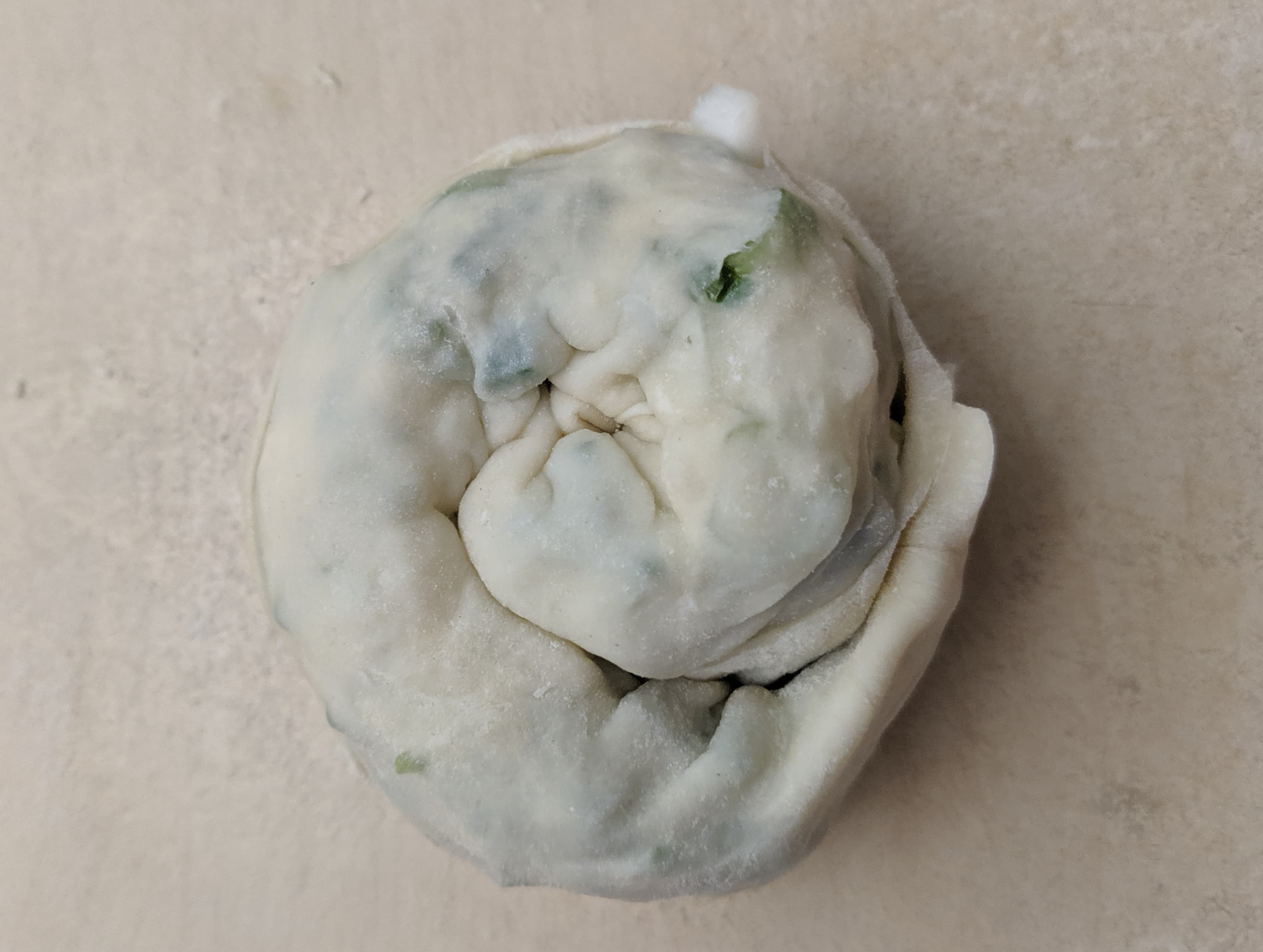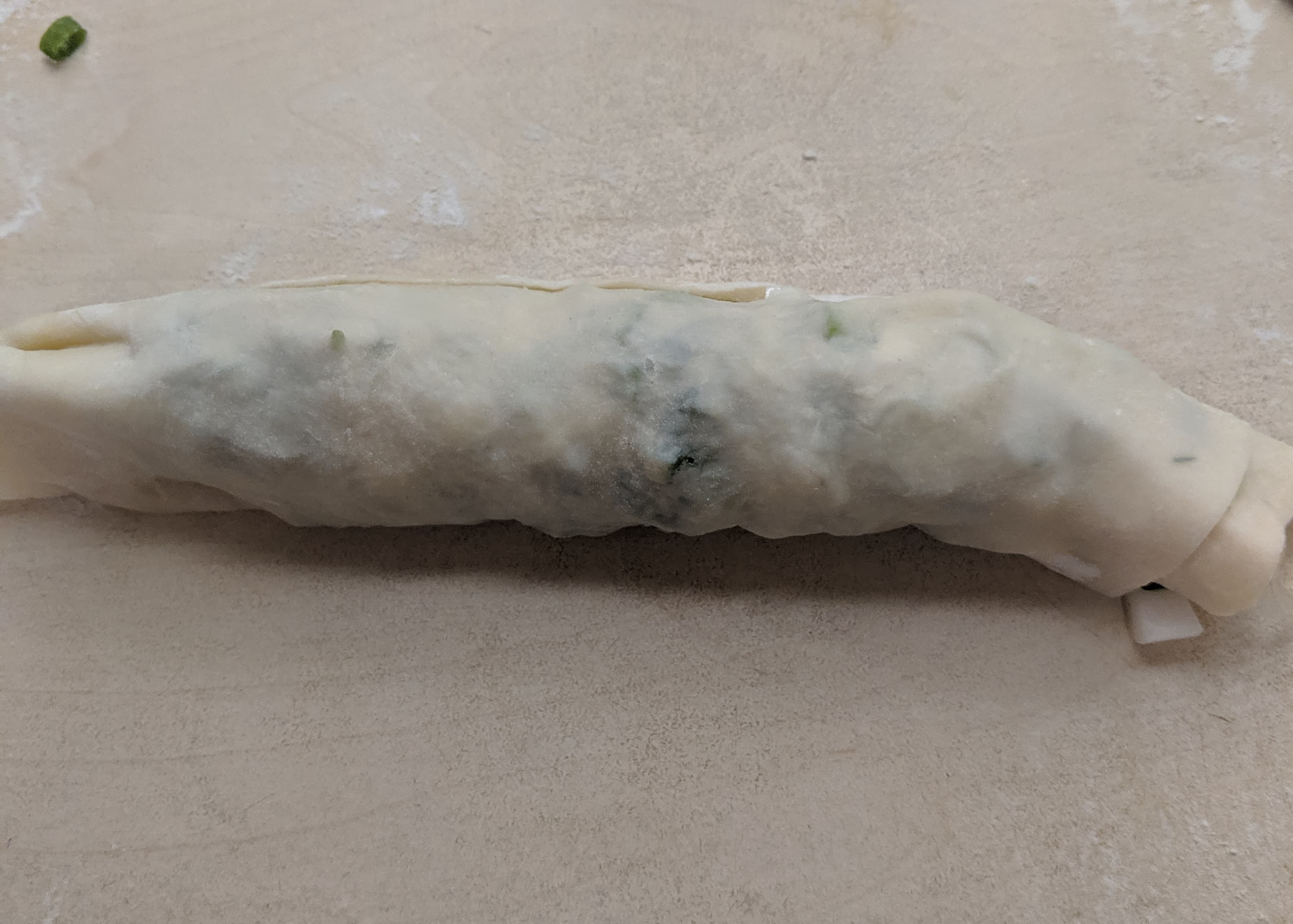 Тут началось самое интересное: трубочку надо свернуть — взять один из ее концов и начать аккуратно заворачивать внутрь спираль. У получившейся улиточки защипываем внешний конец и бережно раскатываем ее обратно в лепешку — теперь не очень тонкую. Тесто иногда рвется, но это не страшно: оно такое липкое, что лук никуда от него не денется.