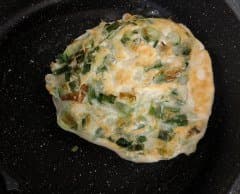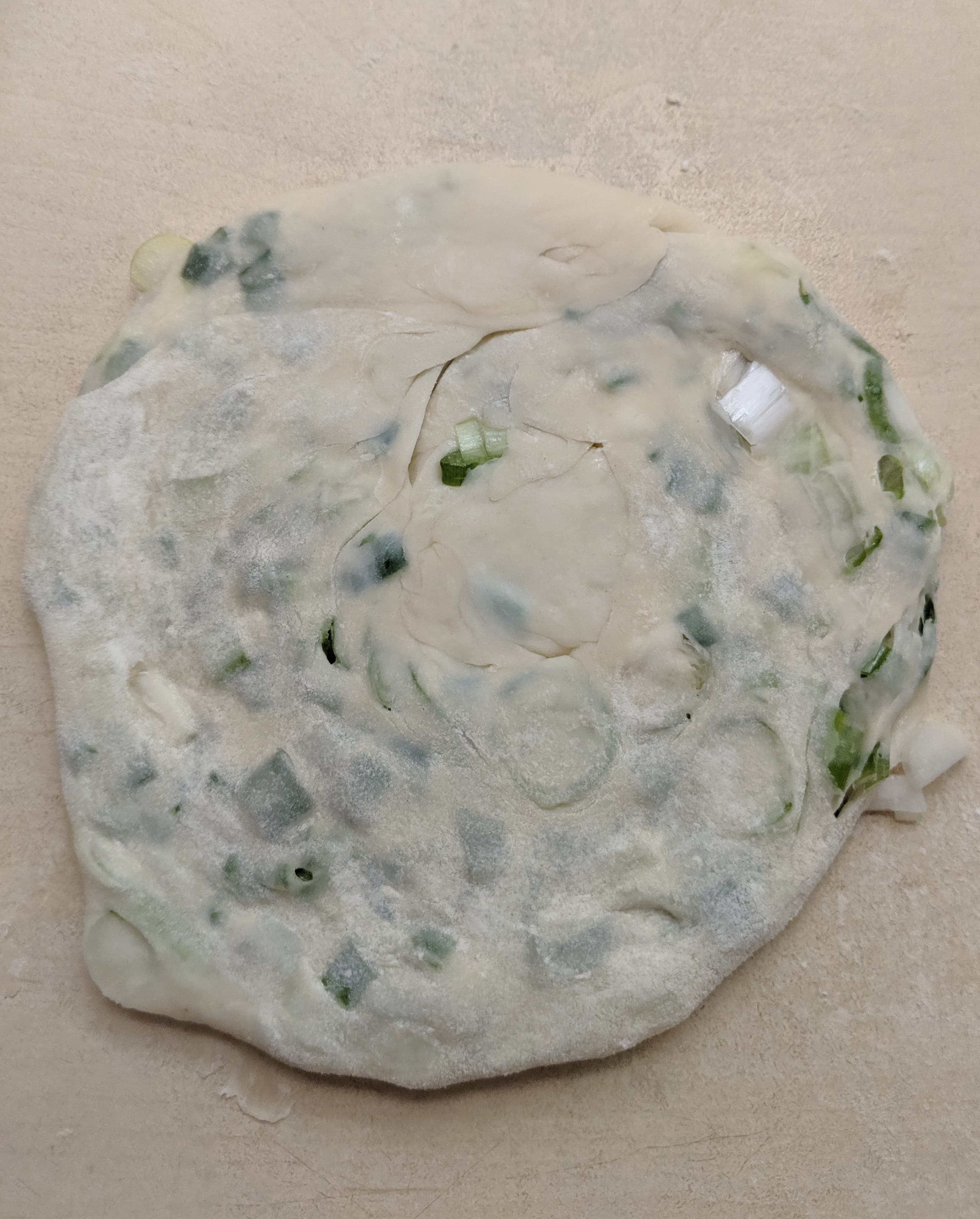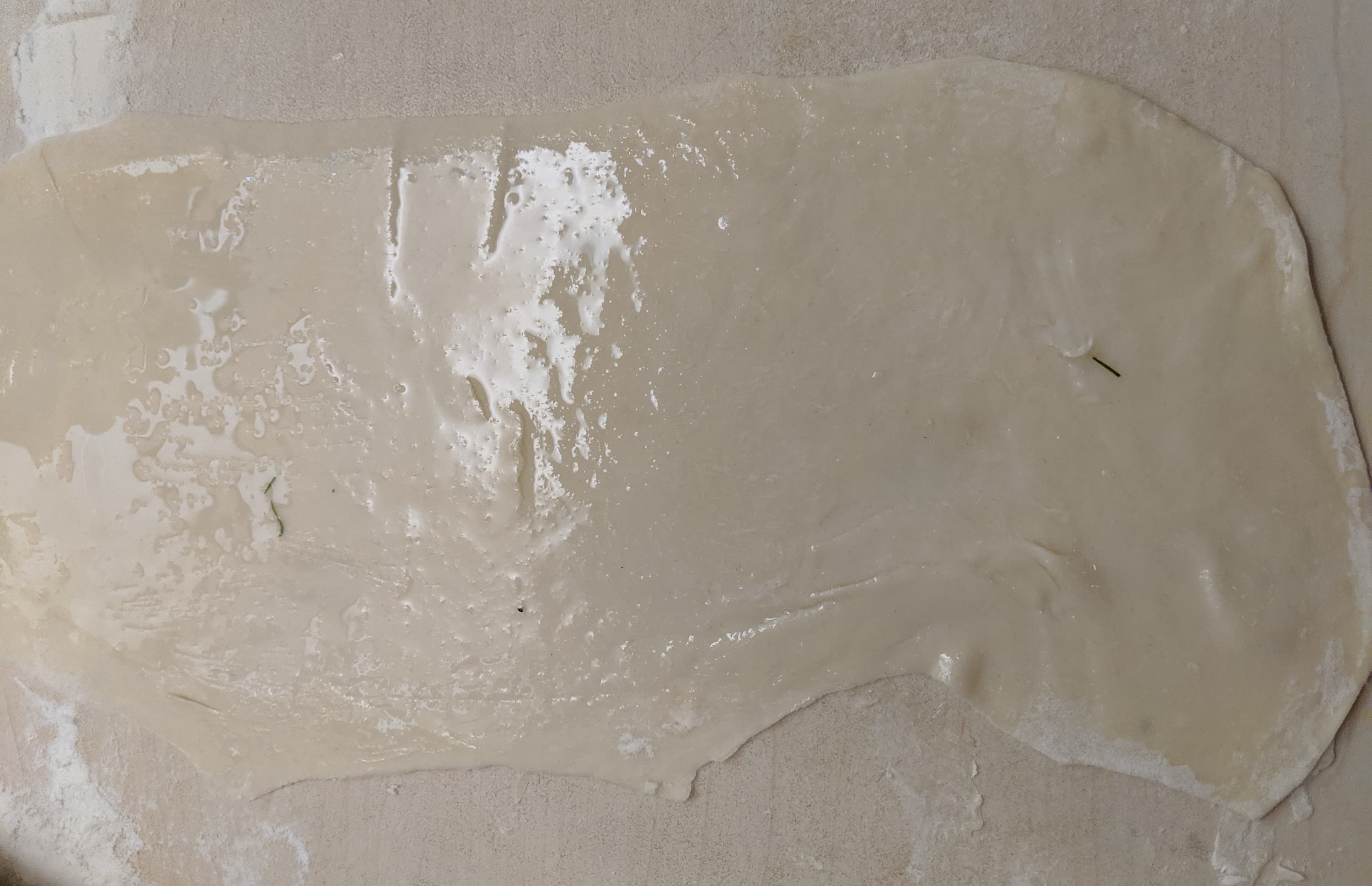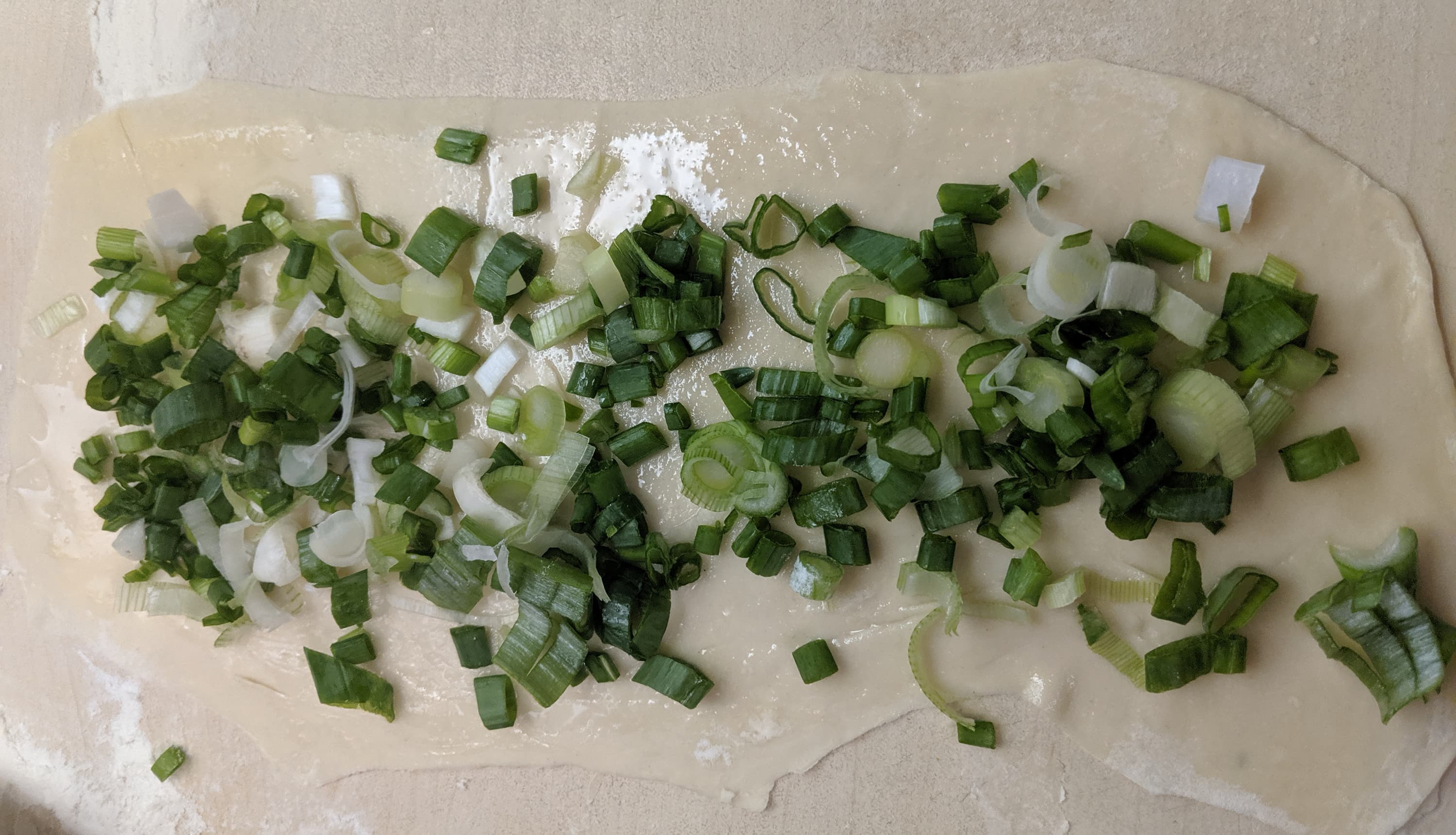 Из получившегося эластичного, нежного и достаточно липкого теста мы раскатали, обильно подсыпая муку, очень тонкие лепешки, смазали их обильно растительным маслом и посыпали начинкой из нарезанного зеленого лука. Посолили, завернули в трубочку.