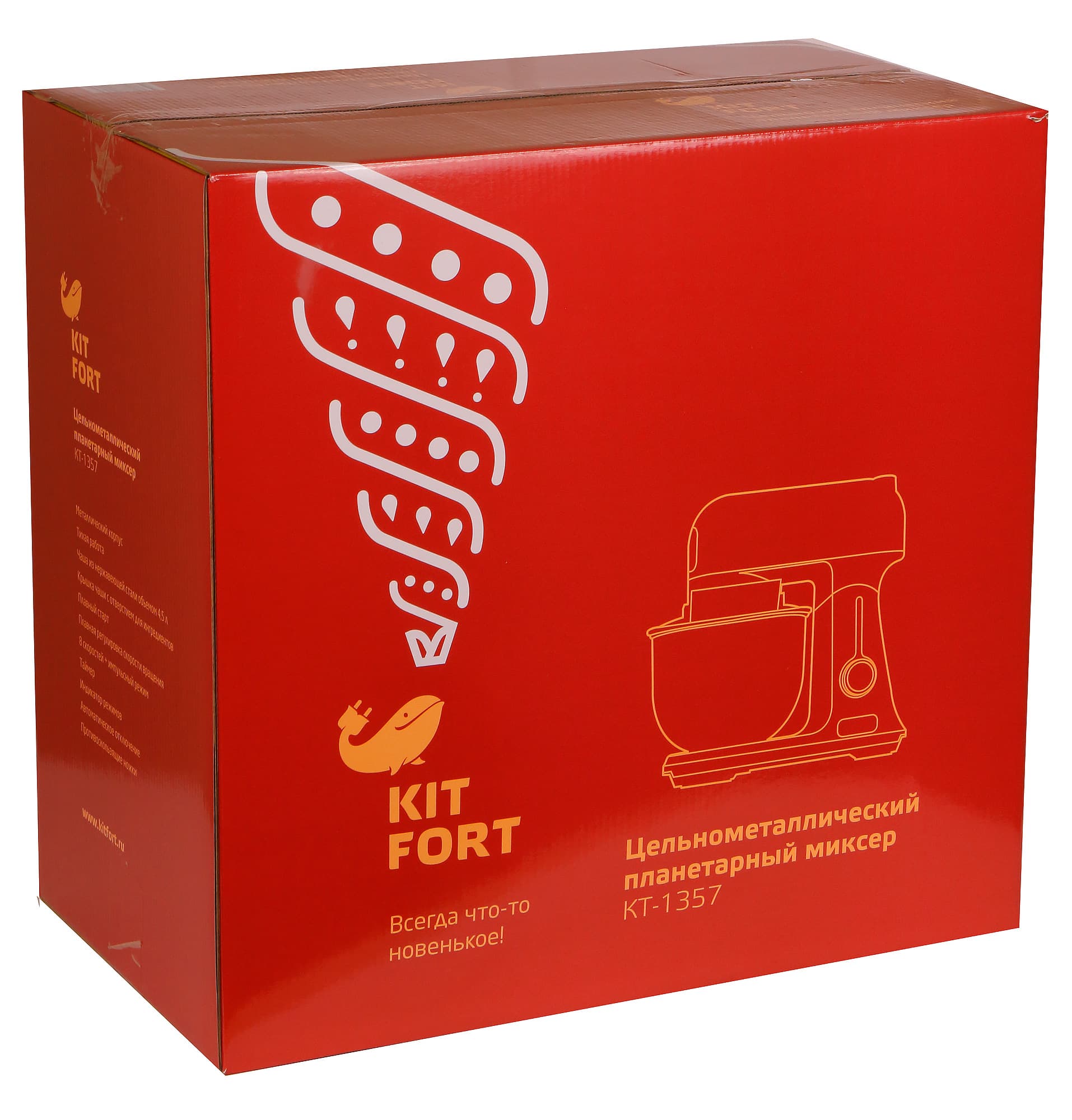 Коробка из глянцевого картона коричневато-бордового цвета украшена изображениями фирменного китфортовского китенка и схематическим небольшим рисунком планетарного миксера с широких сторон. На этих сторонах есть еще девиз компании «Всегда что-то новенькое!» и марка и модель планетарного миксера.