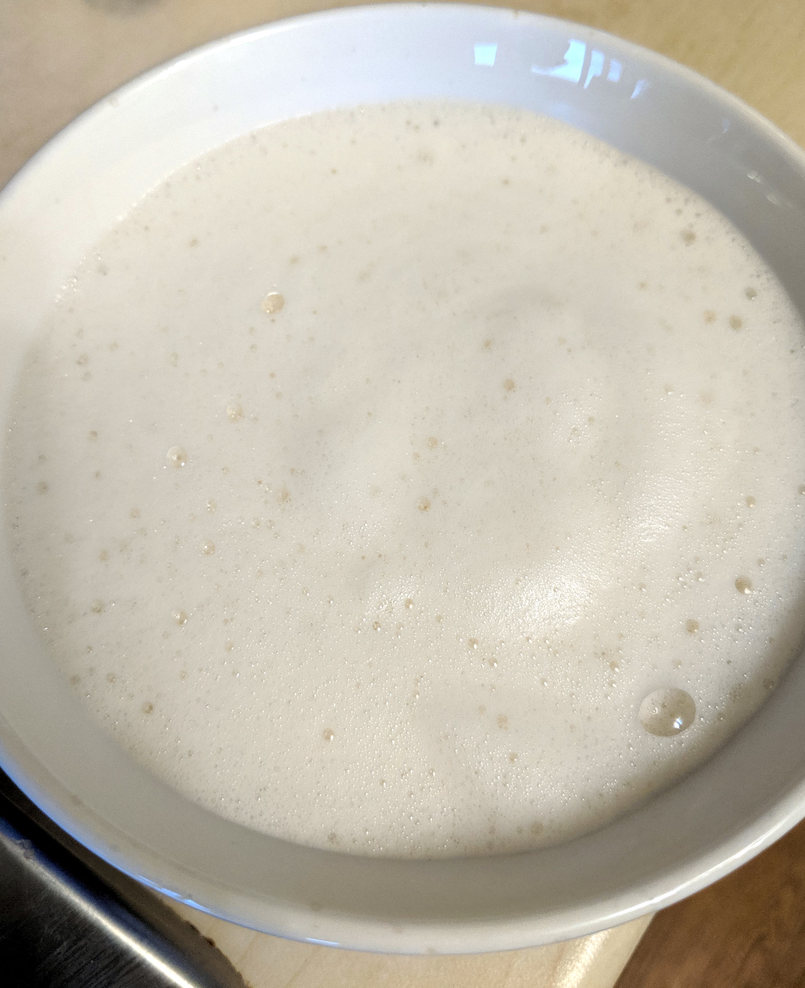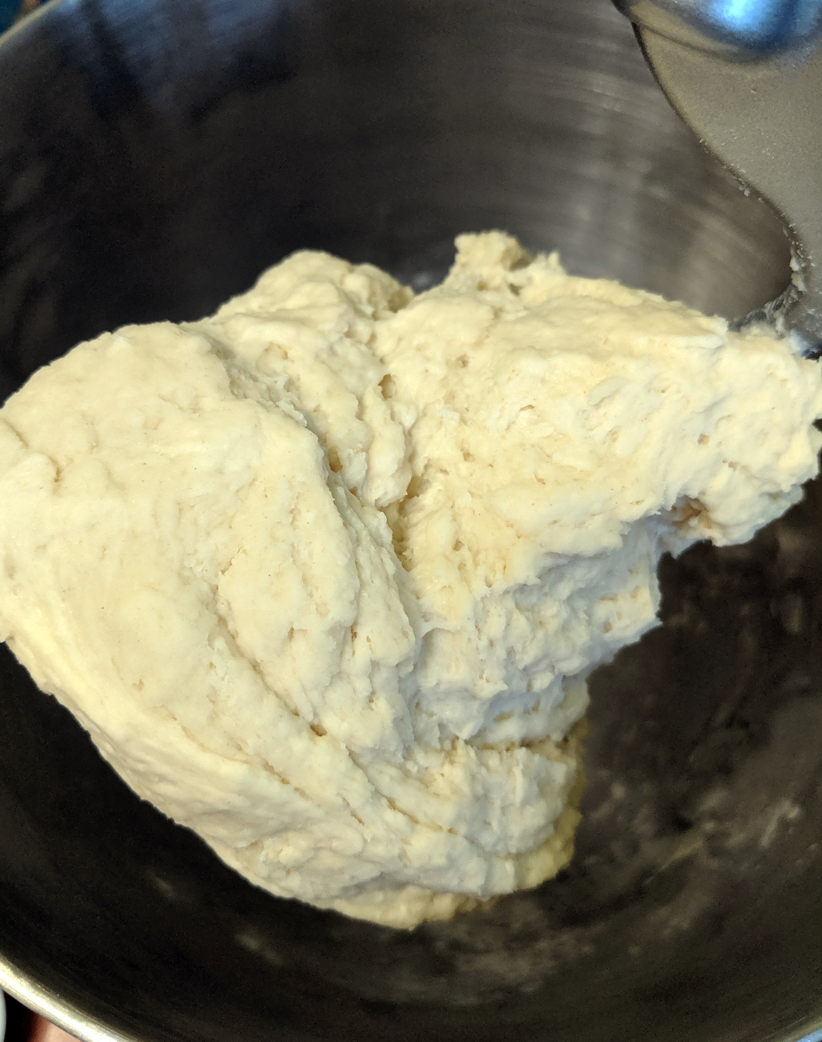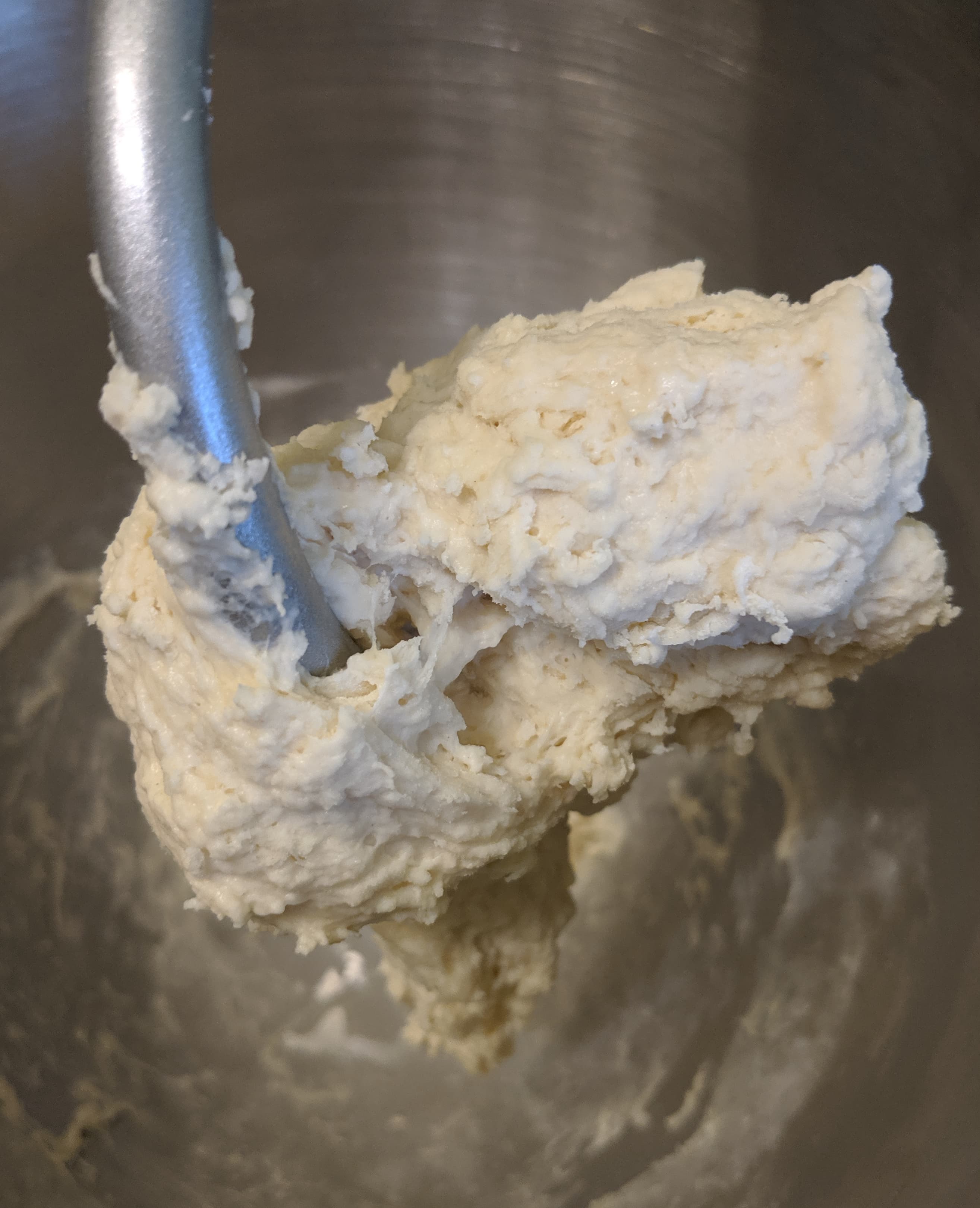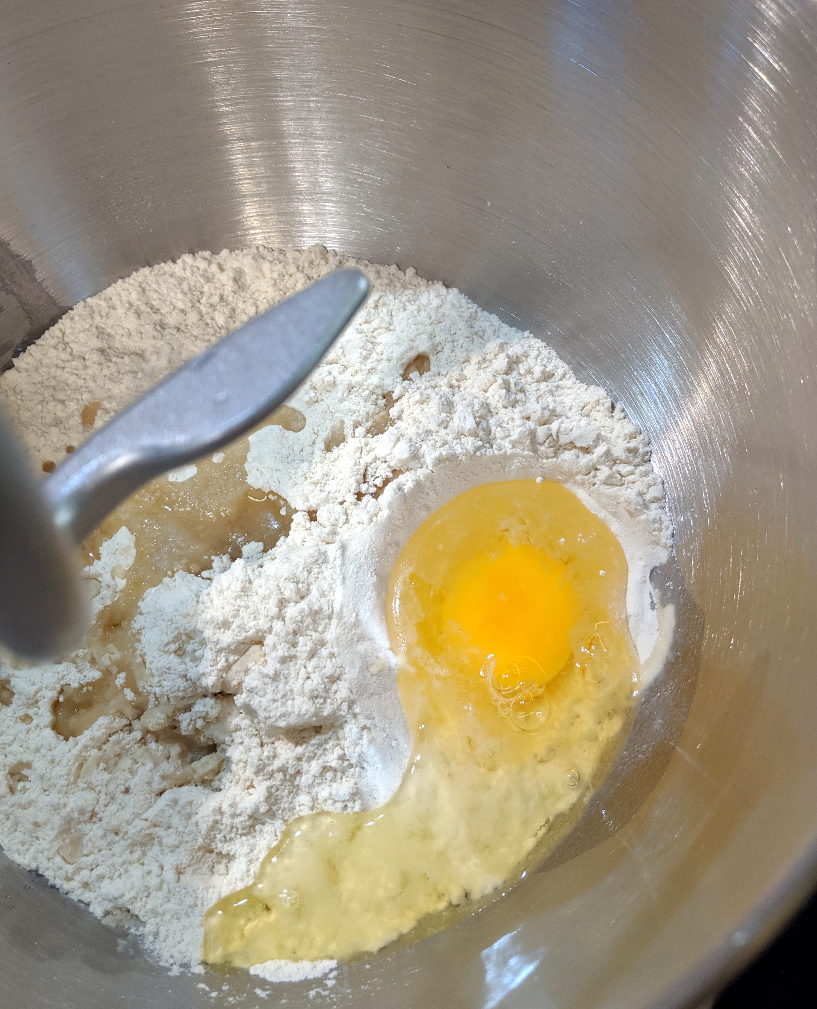 Нам попался на глаза интересный рецепт, который предполагал замешивание теста из двух частей: в одной муку заваривали кипятком, в другой смешивали с холодной водой. В рецепте это предлагалось делать в одной посуде, но планетарный миксер так не умеет — да и не надо.