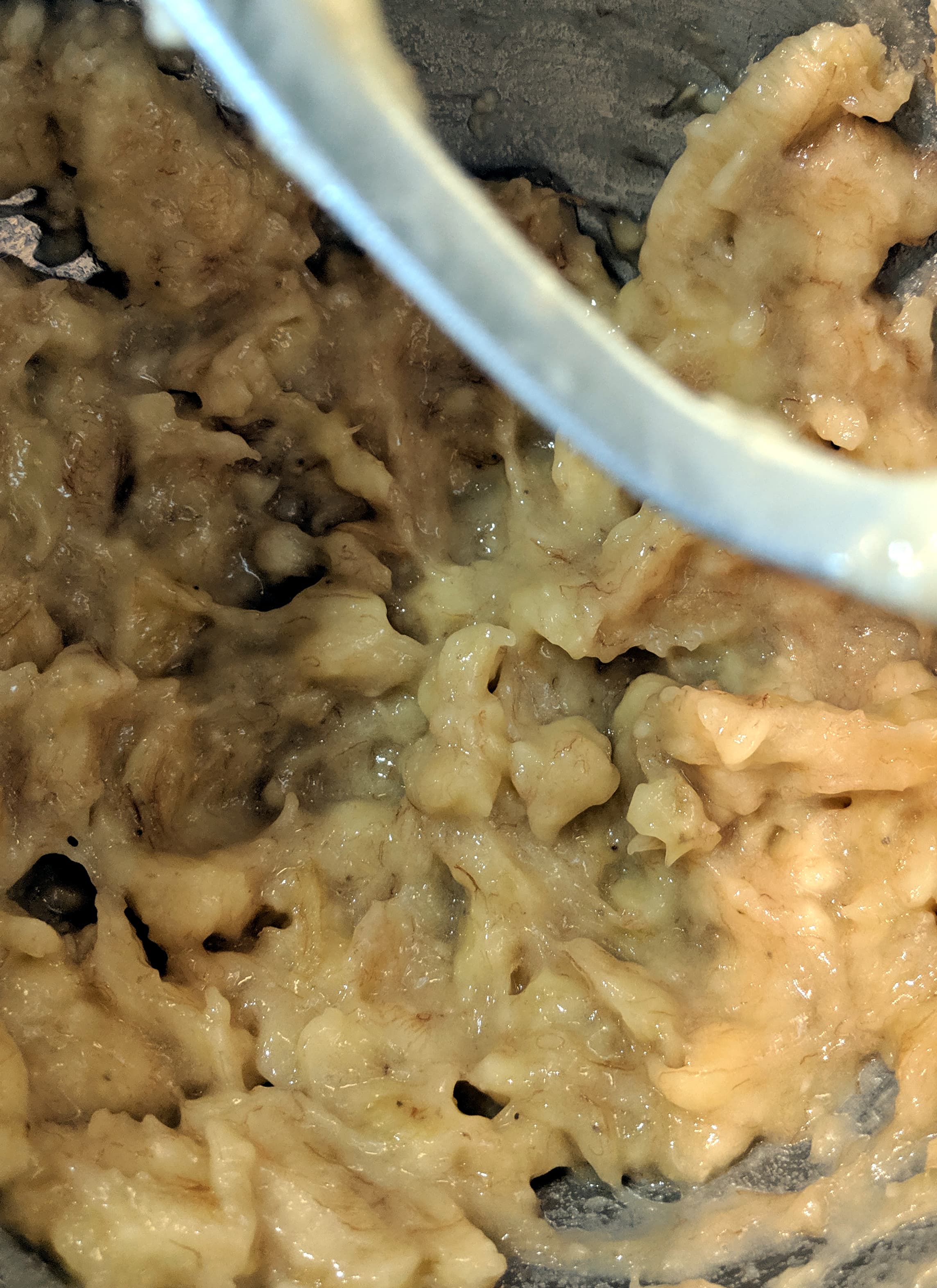 Три довольно мягких банана мы наломали на крупные куски и запустили насадку для смешивания на скорости 3-4. Через минуту бананы превратились в однородное пюре. Тогда мы положили в чашу пол-литра густого йогурта: сначала попробовали через отверстие в крышке, но затем убедились, что так хорошо добавлять только сыпучие или совсем жидкие продукты, с густым веществом не получилось.