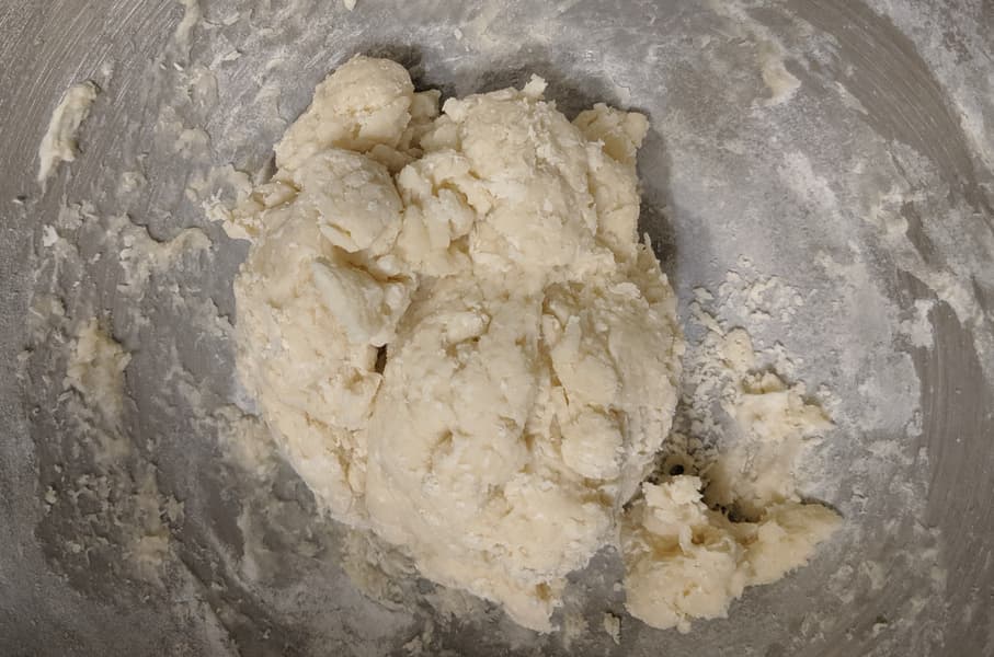 Сначала размешали все ингредиенты, кроме воды, до образования мелкой крошки, затем вылили в тесто горячую воду и смотрели, как оно замешивается. На краях оставалось немного налипшего продукта, а на дне никак не хотела замешиваться мелкая мучная крошка, но через восемь с половиной минут у нас был отлично замешанный однородный ком эластичного и достаточно крутого теста.