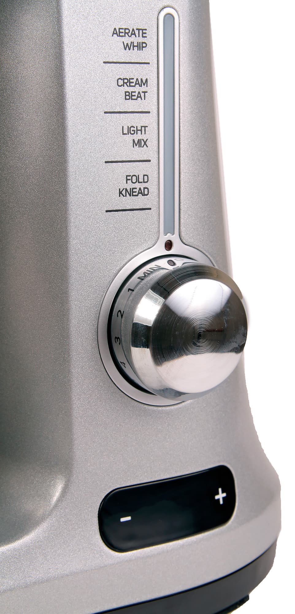 С правого бока планетарного миксера, но как-то так, что и левшам удобно пользоваться, на вертикальной «ноге» прибора располагается панель управления. Она состоит, если смотреть снизу вверх, из таймера, вращающейся круглой рукояти переключения скоростей и светового индикатора выбранного режима.