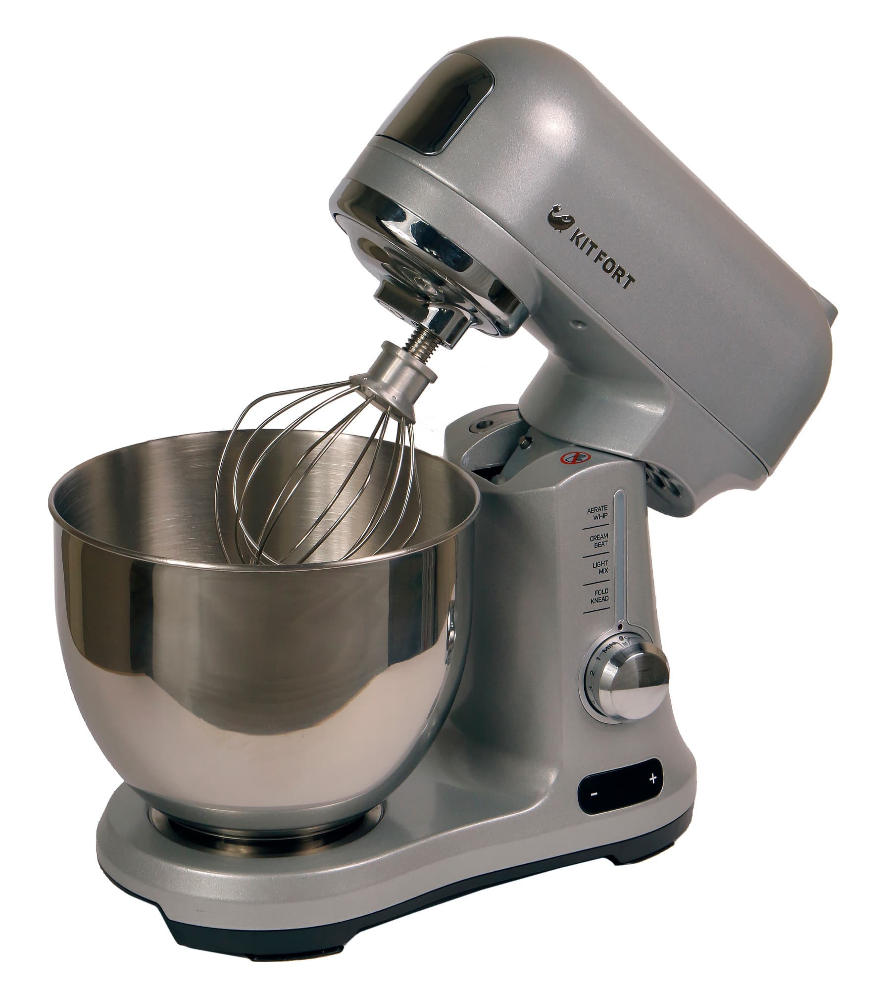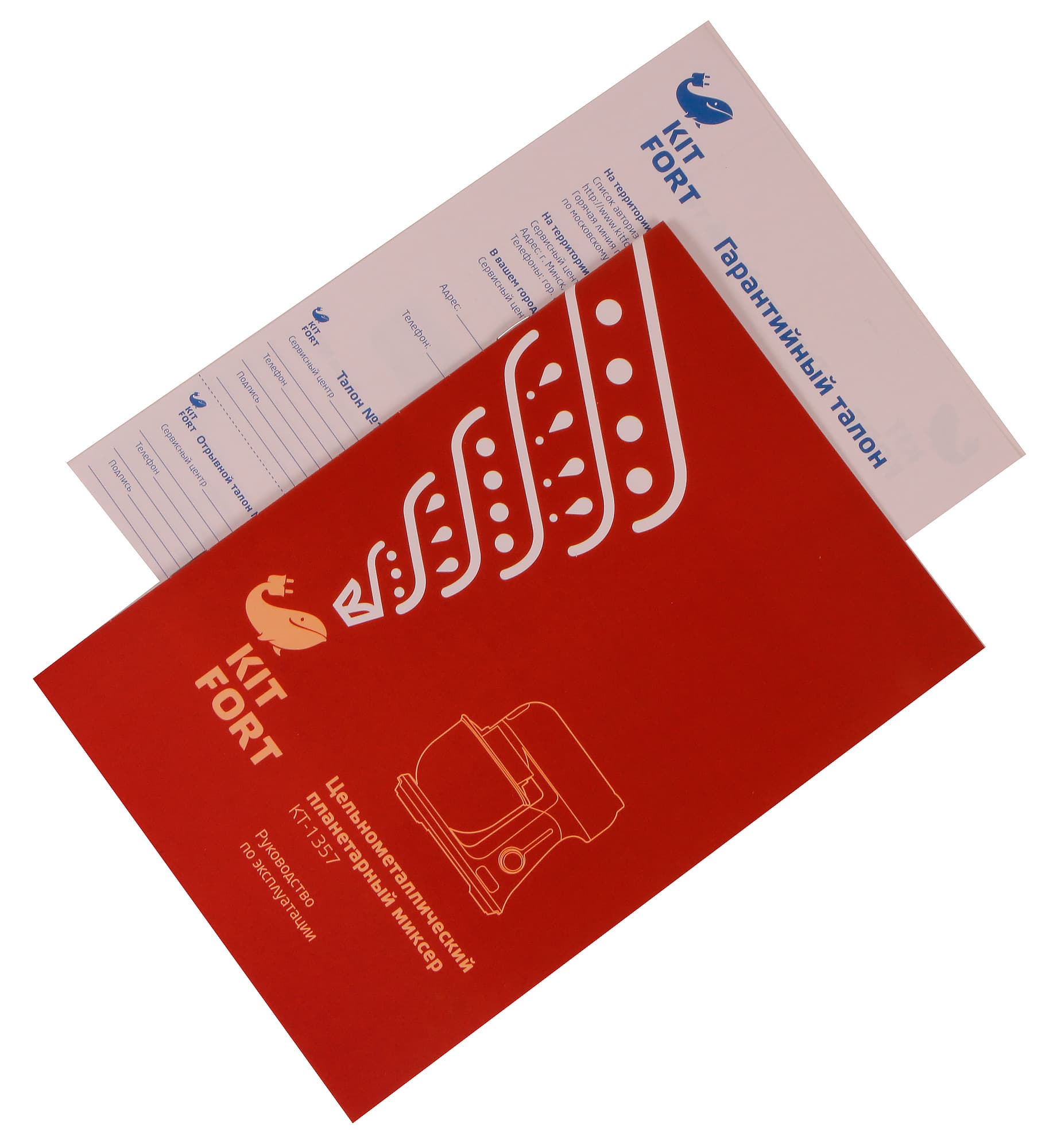 Руководство по эксплуатации цельнометаллического планетарного миксера Kitfort KT-1357 представляет собой брошюру в глянцевой плотной обложке темного коричневато-бордового цвета. На обложке изображены миксер — схематически — и фирменный китенок Kitfort, издающий восторженные вопли. По крайней мере, так мы перевели сочетание знаков препинания над его головой. Хотя, возможно, дизайнер хотел нарисовать фонтан.