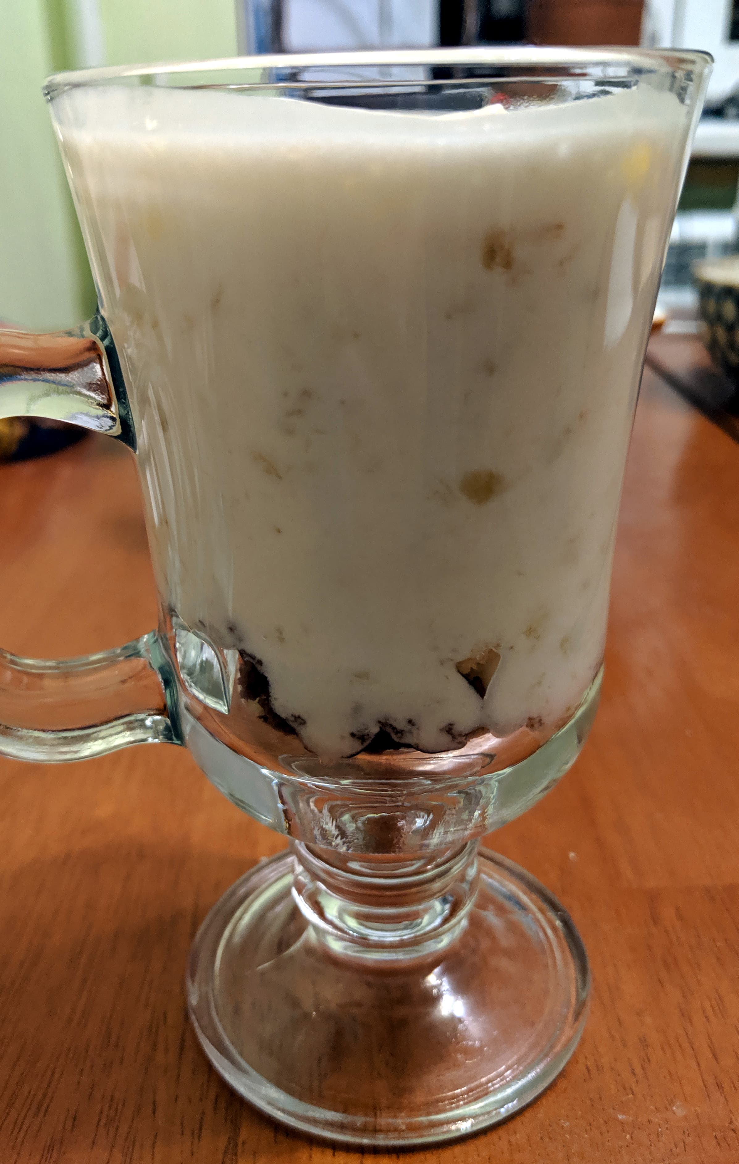 Получился практически однородный, равномерно насыщенный изюмом йогурт. Кусочки банана если и оставались, то были очень маленькими.