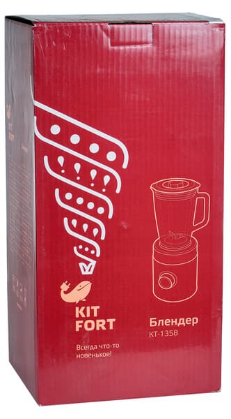 Блендер прибыл на тестирование в простой упаковочной коробке бюджетного исполнения без ручек и прочих деталей. Коробка оформлена в едином корпоративном стиле, на ней присутствует название и описание модели, а также большая броская визитка с координатами и часами работы горячей линии Kitfort.