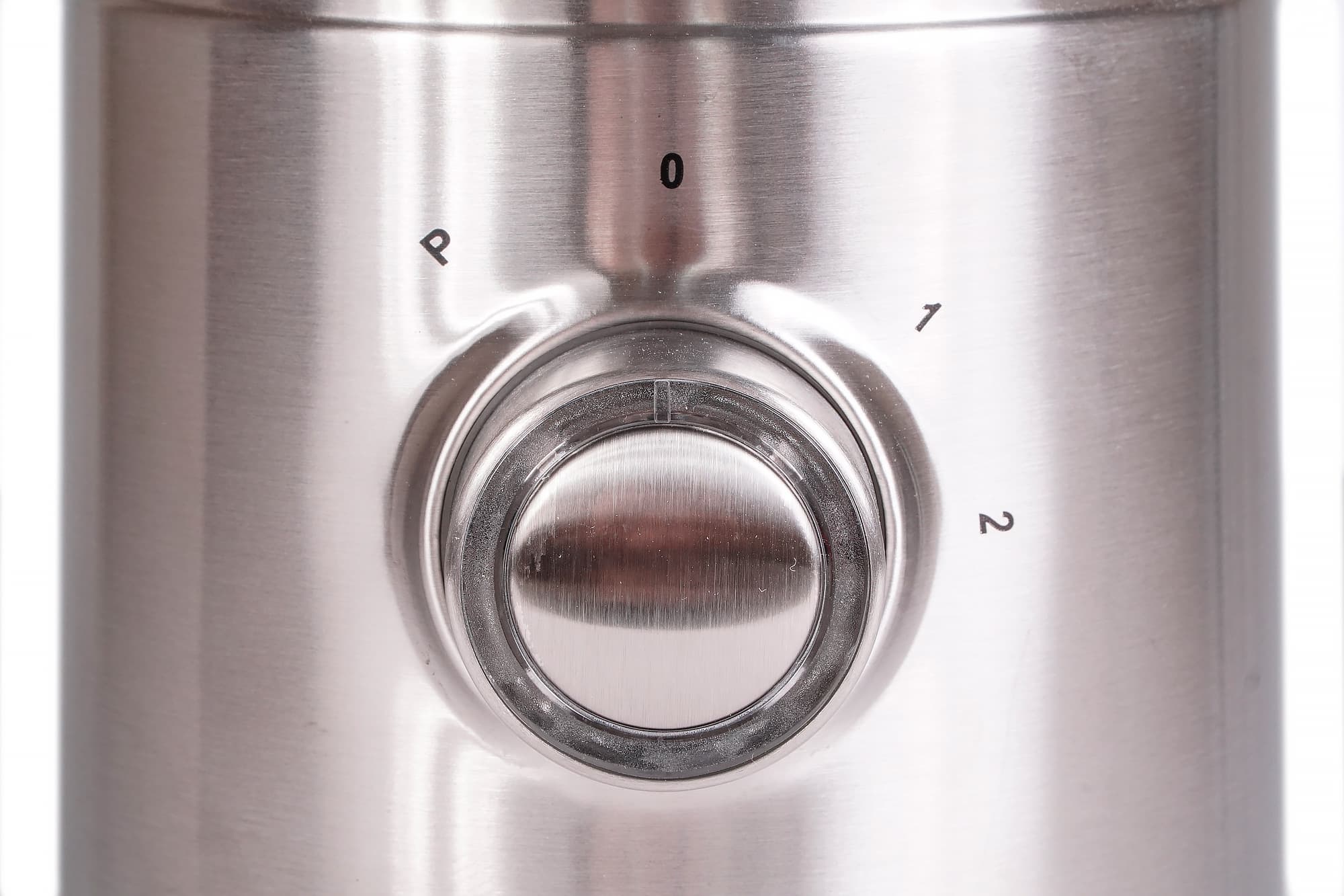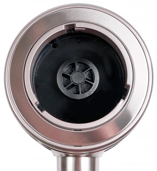 При первом рассмотрении KT-1358 не вызывает бурных эмоций. Он небольшой, не тяжелый, без броских элементов дизайна. Такой прибор впишется в практически любой интерьер, но взгляда не притянет. Моторный блок изготовлен из пластика и закрыт металлической накладкой. На нем мы видим круглую ручку — единственный элемент управления. Кроме нее на корпусе есть выштампованный логотип Kitfort и четыре напечатанных значка положения ручки. Снизу предусмотрен отсек для хранения шнура, но он не очень удобен.