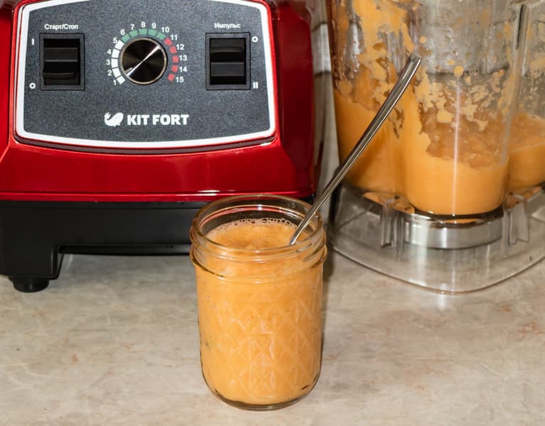 Начинали работу с первой скорости, в конце увеличили до пятой. Измельчали около полутора минут. Масса получилась совершенно однородная, без отдельных кусочков яблок.