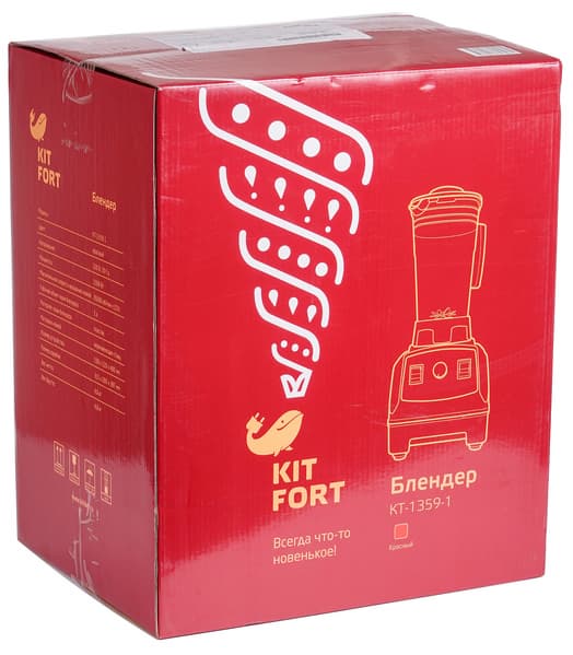 Блендер, как и все приборы Kitfort, поставляется в одноцветной, в данном случае красной, картонной коробке, оформленной просто, но информативно. Изучив упаковку, пользователь ознакомится с техническими характеристиками и описанием достоинств прибора. Схематическое изображение на фронтальной грани коробки поможет сложить впечатление о внешнем виде устройства. Каким-либо приспособлением для переноски упаковка не оснащена.