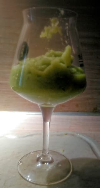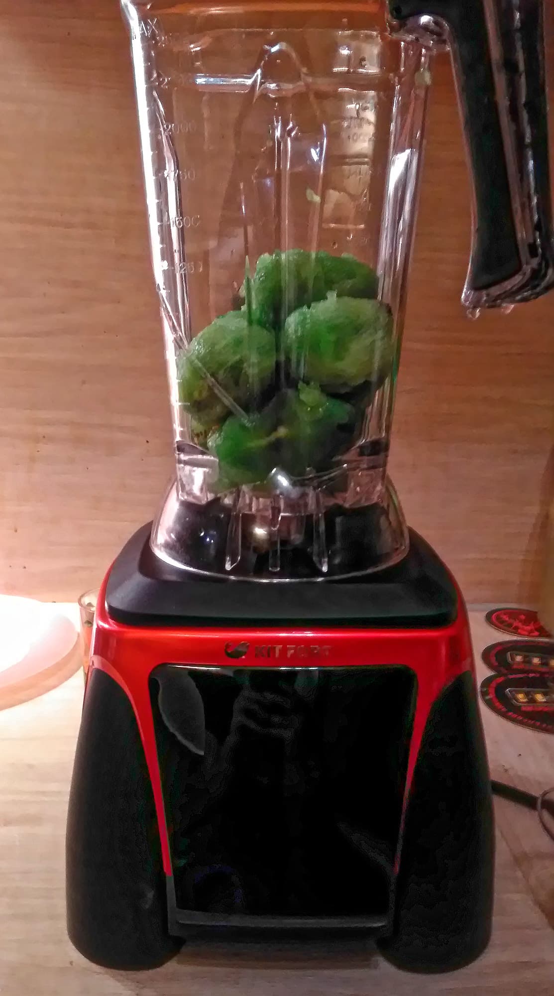 Сделано по заказу одного из детей — в его понятии в экзотический коктейль должны были входить киви, апельсиновый и ананасовый сок и колотый лед. 500 г киви мы почистили и загрузили в блендер.