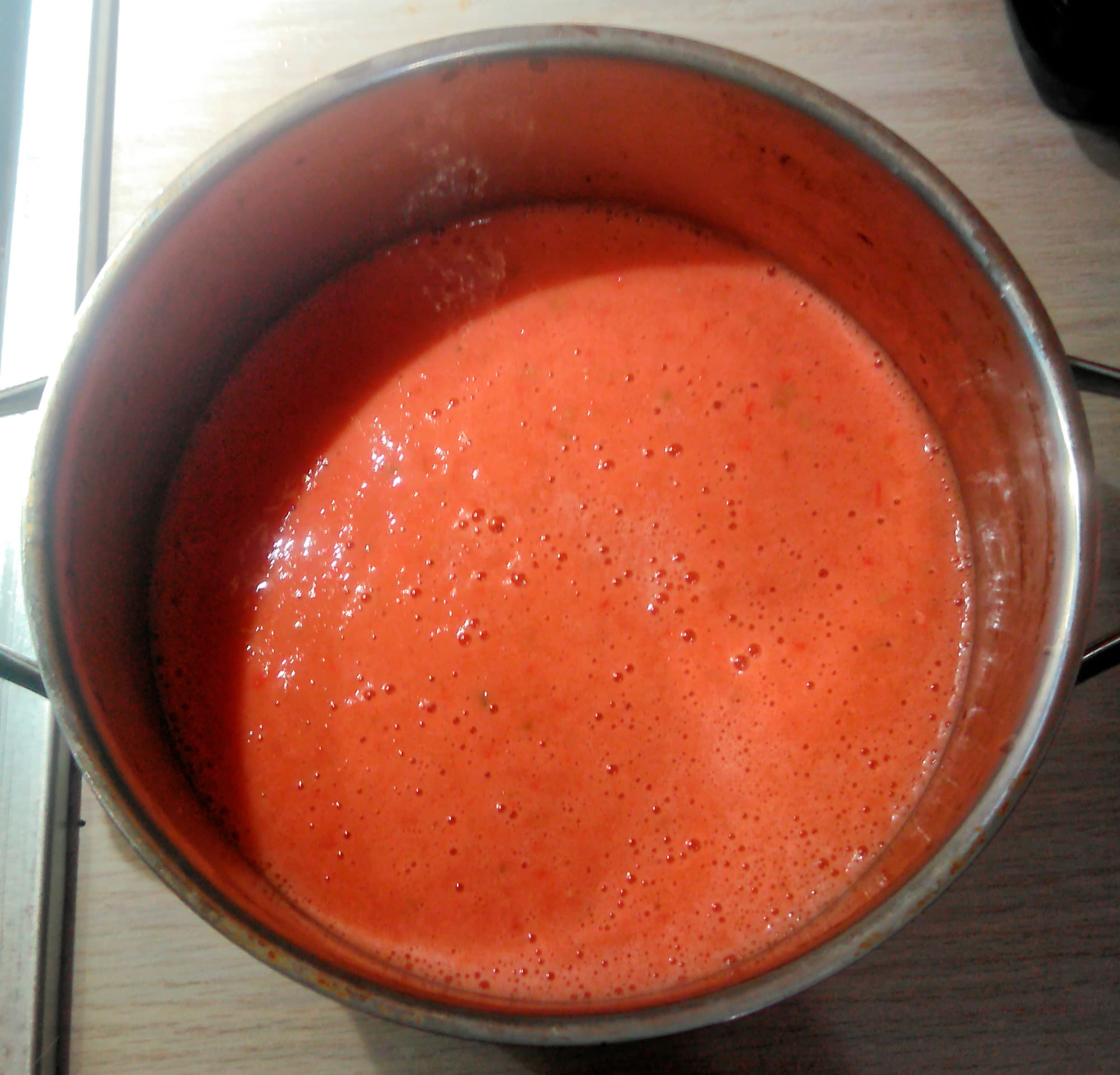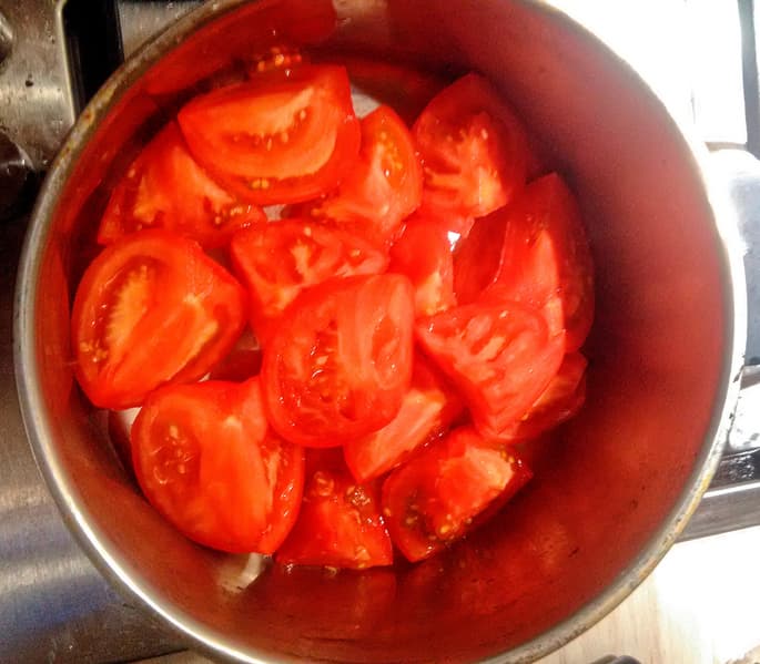 Для приготовления домашнего кетчупа, в принципе, нужно не так уж и много: хорошие томаты, специи, время подождать, и, главное, фантазия автора. Ах да, еще нужен блендер. На рынке у проверенных продавцов были закуплены «памидор, хороший, мясистый» — 2 кг. Отдельно — два зеленых перца чили и один халапеньо. Все томаты были порезаны на куски, кожу мы не снимали.