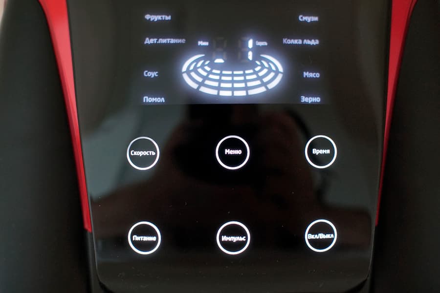 Блендер оснащен сенсорной панелью управления. Сразу после включения в розетку прибор переходит в состояние ожидания, которое можно прервать нажатием кнопки «Питание». После чего происходит переход в основную панель, где нам предлагается либо самостоятельно выбрать время и скорость обработки продуктов, тип обработки (постоянный или импульсный), либо перейти (кнопка «меню») в предустановленные режимы — «смузи», «фрукты», «мясо», «зерно», «колка льда», «помол», «соус», «детское питание».