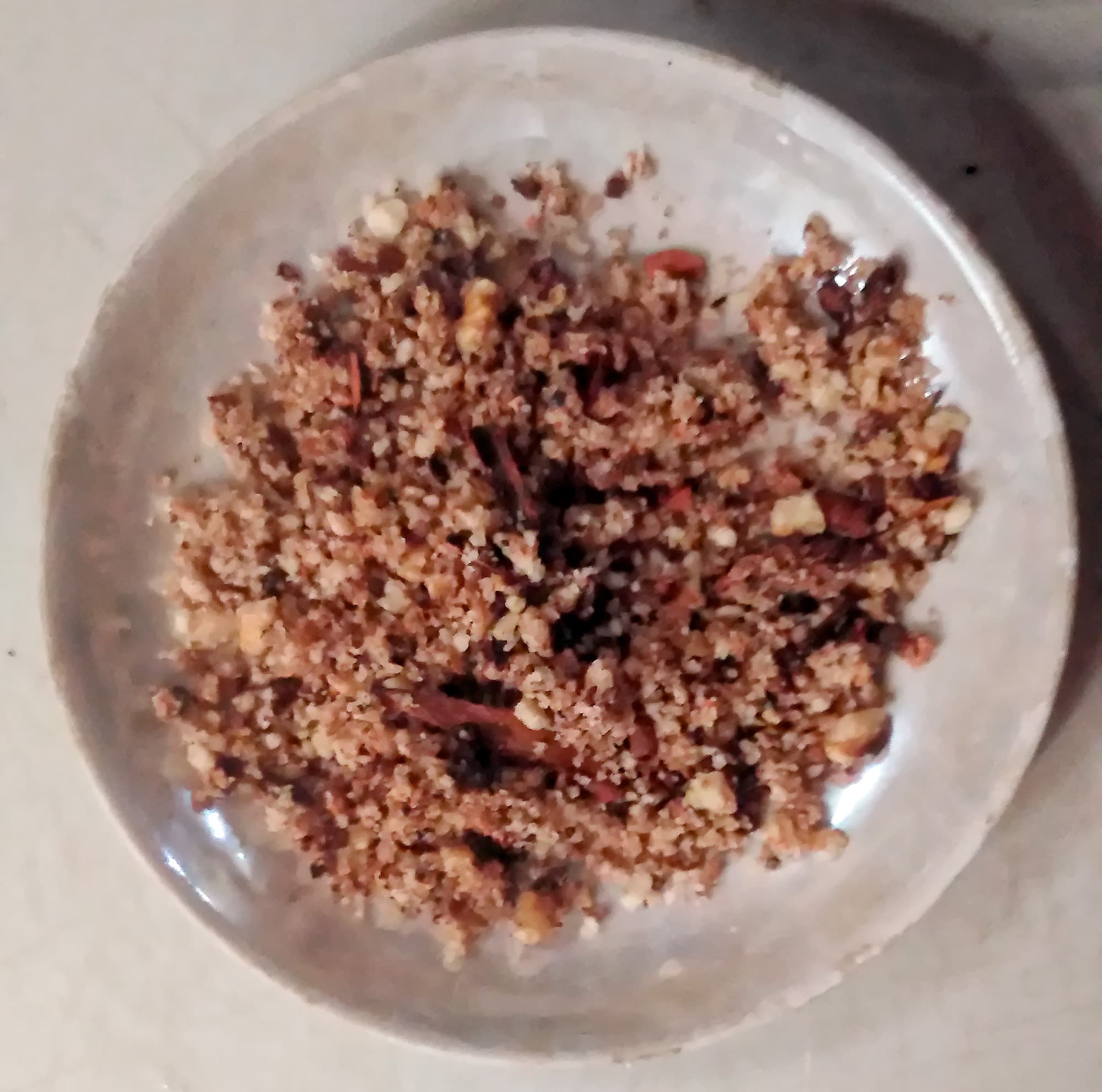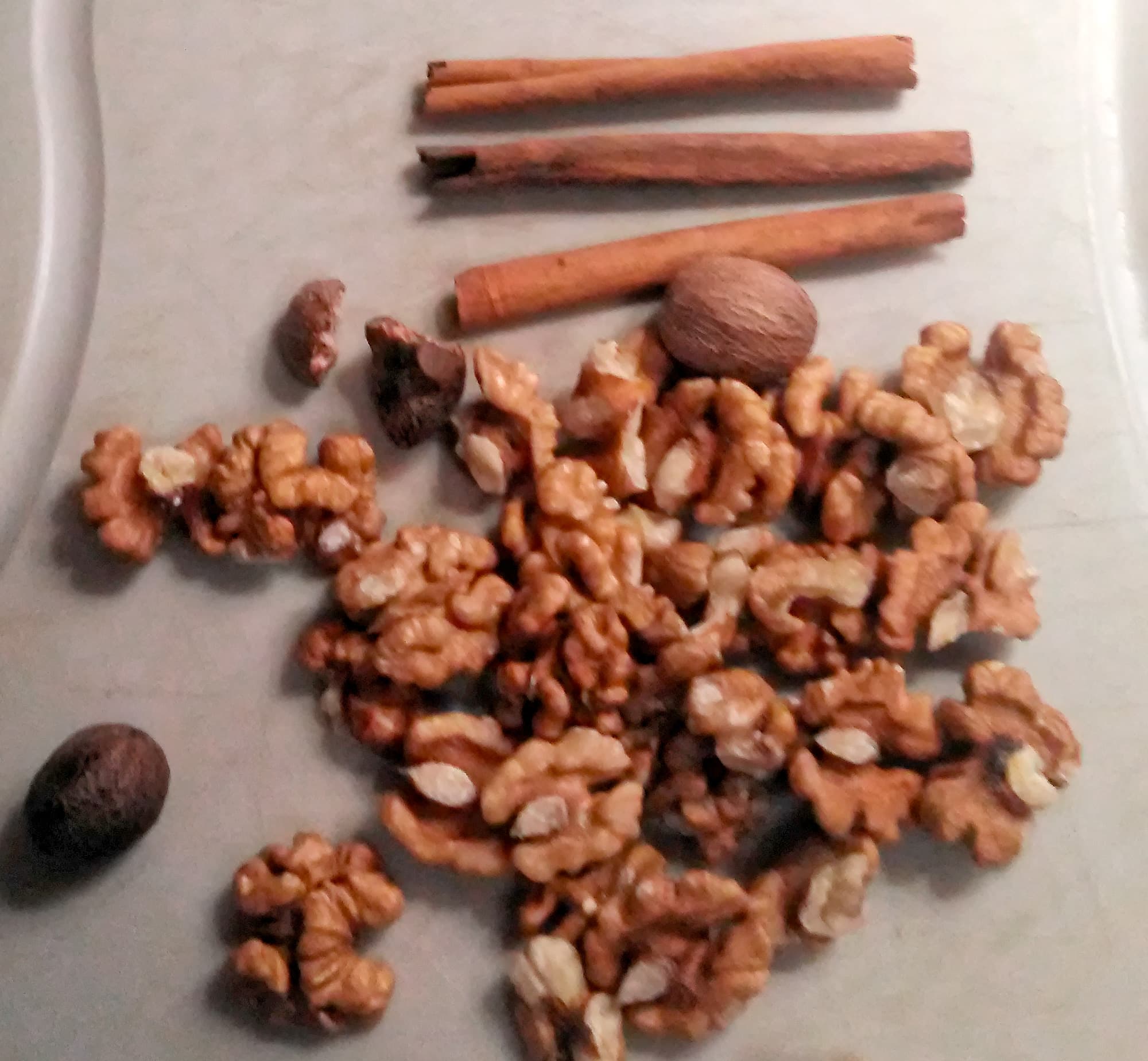 Именно здесь мы неожиданно встретились с серьезными проблемами. Хотя, казалось бы — чего проще? Несколько палочек корицы, три мускатных ореха и 70 г грецких орехов.
